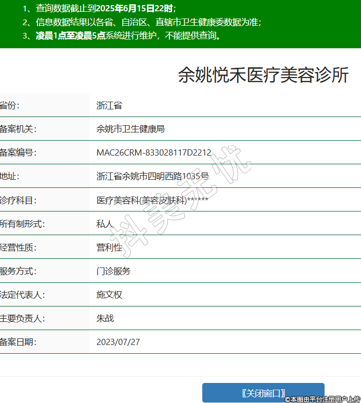 省份:浙江省備案機(jī)關(guān):余姚市衛(wèi)生健康局備案編號(hào):MAC26CRM-833028117D2212地址:浙江省余姚市四明西路1035號(hào)診療科目:醫(yī)療美容科(美容皮膚科)******所有制形式:私人經(jīng)營(yíng)性質(zhì):營(yíng)利性服務(wù)方式:門(mén)診服務(wù)法定代表人:施文權(quán)主要負(fù)責(zé)人:朱戰(zhàn)備案日期:2023/07/27 -