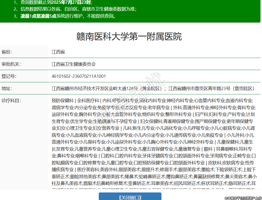 省份:江西省審批機關:江西省衛(wèi)生健康委員會登記號:46101602-236070211A1001地址:江西省贛州市經(jīng)濟技術開發(fā)區(qū)金嶺大道128號(黃金院區(qū));江西省贛州市章貢區(qū)青年路23號(章貢院區(qū))診療科目:預防保健科 | 全科醫(yī)療科 | 內(nèi)科;呼吸內(nèi)科專業(yè);消化內(nèi)科專業(yè);神經(jīng)內(nèi)科專業(yè);心血管內(nèi)科專業(yè);血液內(nèi)科專業(yè);腎病學專業(yè);內(nèi)分泌專業(yè);免疫學專業(yè);變態(tài)反應專業(yè);老年病專業(yè) | 外科;普通外科專業(yè);神經(jīng)外科專業(yè);骨科專業(yè);泌尿外科專業(yè);胸外科專業(yè);心臟大血管外科專業(yè);燒傷科專業(yè);整形外科專業(yè) | 婦產(chǎn)科;婦科專業(yè);產(chǎn)科專業(yè);計劃生育專業(yè);優(yōu)生學專業(yè);生殖健康與不孕癥專業(yè) | 婦女保健科;青春期保健專業(yè);圍產(chǎn)期保健專業(yè);更年期保健專業(yè);婦女心理衛(wèi)生專業(yè);婦女營養(yǎng)專業(yè) | 兒科;新生兒專業(yè);小兒消化專業(yè);小兒呼吸專業(yè);小兒心臟病專業(yè);小兒腎病專業(yè);小兒血液病專業(yè);小兒神經(jīng)病學專業(yè);小兒內(nèi)分泌專業(yè);小兒遺傳病專業(yè);小兒免疫專業(yè) | 小兒外科;小兒普通外科專業(yè);小兒骨科專業(yè);小兒泌尿外科專業(yè);小兒胸心外科專業(yè);小兒神經(jīng)外科專業(yè) | 兒童保健科;兒童生長發(fā)育專業(yè);兒童營養(yǎng)專業(yè);兒童心理衛(wèi)生專業(yè);兒童五官保健專業(yè);兒童康復專業(yè) | 眼科 | 耳鼻咽喉科;耳科專業(yè);鼻科專業(yè);咽喉科專業(yè) | 口腔科;口腔內(nèi)科專業(yè);牙體牙髓病專業(yè);口腔頜面外科專業(yè);牙周病專業(yè);正畸專業(yè);口腔粘膜病專業(yè);口腔修復專業(yè);兒童口腔專業(yè);口腔預防保健專業(yè);口腔頜面外科專業(yè) | 皮膚科;皮膚病專業(yè);性傳播疾病專業(yè) | 醫(yī)療美容科;美容外科;眉部美容術;眉提升術;修眉手術;眼部美容術;重瞼術;下瞼袋矯正術;上瞼下垂矯正術;眼瞼其他美容術;鼻部美容術;隆鼻術;駝峰鼻矯正術;鷹鉤鼻矯正術;鼻翼缺損修復術;鼻尖美容術;鼻小柱及鼻孔美容術;唇裂術后鼻畸形修復術;歪鼻矯正術;耳廓美容術;招風耳矯正術;杯狀耳矯正術;隱耳矯正術;耳垂畸形修復術;耳廓再造術;口唇部美容術;唇裂修復術;唇裂術后畸形修復術;重唇美容術;唇峰、薄唇增厚美容術;唇珠美容術;口角成形術;酒窩成形術;唇系帶延長成形術;頜面部美容術;顳部填充術;顴部美容術;頦成形術;面部除皺術;額部除皺術;顳部除皺術;面頸部除皺術;中面部除皺術;額顳部除皺術;額顳面部除皺術;顳面頸部除皺術;全面頸部除皺術;內(nèi)窺鏡除皺術;面部懸吊除皺術;乳房美容術;隆乳術;乳房肥大縮小術;乳頭內(nèi)陷矯正術;乳頭肥大縮小術;乳房下垂矯正術;乳頭乳暈重建術;脂肪抽吸及腹壁成形術;負壓脂肪抽吸術;超聲脂肪抽吸術;電子吸脂術;注射器法吸脂術;腹壁成形術;會陰部美容術;處女膜修復術;陰道松弛縮緊術;陰蒂肥大縮小術;小陰唇肥大縮小術;包皮環(huán)切術;陰莖延長術;美容牙科;牙齒美容修復技術;潔齒術;牙齒修形術;牙齒漂白術;復合樹脂黏結(jié)修復技術;瓷貼面修復技術;樁冠修復技術;金屬烤瓷冠橋修復技術;全瓷冠技術;自凝丙稀酸樹脂臨時冠技術;可摘局部義齒美容修復技術;全口義齒美容修復技術;即刻義齒美容修復技術;植牙美容修復技術;黏結(jié)鑄造固定橋美容修復技術;柔性義齦美容修復技術;隱形義齒美容修復技術;套筒冠義齒美容修復技術;牙周美容技術操作;牙齦切除術;牙齦成形術;牙冠延長術;牙周骨手術;根尖向復位瓣術;側(cè)向轉(zhuǎn)位瓣術;雙乳頭瓣移位術;冠向復位瓣術;自體游離齦瓣移植術;牙周引導組織再生術;牙槽骨修整術;牙槽骨嵴修整術;牙槽嵴增高術;牙頜畸形美容矯治技術;機械性活動性矯治器矯治技術;功能性矯治器矯治技術;固定矯治技術;美容皮膚科;美容皮膚術(外科);診斷技術;真菌鏡檢技術;斑貼試驗技術;皮膚活檢術;治療技術;糖皮質(zhì)激素皮損內(nèi)注射;藥物加壓治療;外用藥物治療;光化學療法;美容皮膚術(內(nèi)科);皮膚磨削術;酒渣鼻切割術;皮膚腫物切除術;拔甲術;刮除術;自體表皮移植術;腋臭手術;足病修治術;醫(yī)療美容心理診斷及輔導;美容醫(yī)療應用技術;物理美容治療術;激光美容治療術;高頻電美容治療;冷凍美容治療;其他物理美容治療;脫毛術;穿耳孔術;注射美容技術;A型肉毒毒素美容注射技術;皮膚(軟組織)注射(填充)美容;美容文飾技術;文眉技術;文眼線技術;文唇技術;不良文飾修復技術 | 精神科;精神病專業(yè);精神衛(wèi)生專業(yè);精神康復專業(yè);社區(qū)防治專業(yè);臨床心理專業(yè) | 傳染科;腸道傳染病專業(yè);呼吸道傳染病專業(yè);肝炎專業(yè);蟲媒傳染病專業(yè);動物源性傳染病專業(yè);蠕蟲病專業(yè) | 腫瘤科 | 急診醫(yī)學科 | 康復醫(yī)學科 | 麻醉科 | 疼痛科 | 重癥醫(yī)學科 | 醫(yī)學檢驗科;臨床體液、血液專業(yè);臨床微生物學專業(yè);臨床化學檢驗專業(yè);臨床免疫、血清學專業(yè);臨床細胞分子遺傳學專業(yè) | 病理科 | 醫(yī)學影像科;X線診斷專業(yè);CT診斷專業(yè);磁共振成像診斷專業(yè);核醫(yī)學專業(yè);超聲診斷專業(yè);心電診斷專業(yè);腦電及腦血流圖
