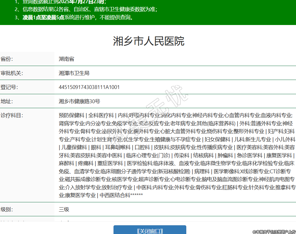 省份:湖南省審批機(jī)關(guān):湘潭市衛(wèi)生局登記號:44515091743038111A1001地址:湘鄉(xiāng)市健康路30號診療科目:預(yù)防保健科 | 全科醫(yī)療科 | 內(nèi)科;呼吸內(nèi)科專業(yè);消化內(nèi)科專業(yè);神經(jīng)內(nèi)科專業(yè);心血管內(nèi)科專業(yè);血液內(nèi)科專業(yè);腎病學(xué)專業(yè);內(nèi)分泌專業(yè);免疫學(xué)專業(yè);變態(tài)反應(yīng)專業(yè);老年病專業(yè);其他(臨床營養(yǎng)科) | 外科;普通外科專業(yè);神經(jīng)外科專業(yè);骨科專業(yè);泌尿外科專業(yè);胸外科專業(yè);心臟大血管外科專業(yè);燒傷科專業(yè);整形外科專業(yè) | 婦產(chǎn)科;婦科專業(yè);產(chǎn)科專業(yè);計(jì)劃生育專業(yè);優(yōu)生學(xué)專業(yè);生殖健康與不孕癥專業(yè) | 婦女保健科 | 兒科;新生兒專業(yè) | 小兒外科 | 兒童保健科 | 眼科 | 耳鼻咽喉科 | 口腔科 | 皮膚科;皮膚病專業(yè);性傳播疾病專業(yè) | 醫(yī)療美容科;美容外科;美容牙科;美容皮膚科;美容中醫(yī)科 | 臨床心理專業(yè)(門診) | 傳染科 | 結(jié)核病科 | 腫瘤科 | 急診醫(yī)學(xué)科 | 康復(fù)醫(yī)學(xué)科 | 麻醉科 | 疼痛科 | 重癥醫(yī)學(xué)科 | 醫(yī)學(xué)檢驗(yàn)科;臨床體液、血液專業(yè);臨床微生物學(xué)專業(yè);臨床化學(xué)檢驗(yàn)專業(yè);臨床免疫、血清學(xué)專業(yè);臨床細(xì)胞分子遺傳學(xué)專業(yè)(新冠核酸檢測) | 病理科 | 醫(yī)學(xué)影像科;X線診斷專業(yè);CT診斷專業(yè);磁共振成像診斷專業(yè);核醫(yī)學(xué)專業(yè);超聲診斷專業(yè);心電診斷專業(yè);腦電及腦血流圖診斷專業(yè);神經(jīng)肌肉電圖專業(yè);介入放射學(xué)專業(yè);放射治療專業(yè) | 中醫(yī)科;內(nèi)科專業(yè);外科專業(yè);骨傷科專業(yè);肛腸科專業(yè);針灸科專業(yè);推拿科專業(yè);康復(fù)醫(yī)學(xué)專業(yè) | 中西醫(yī)結(jié)合科******級別:三級法定代表人:李昕陽主要負(fù)責(zé)人:李昕陽執(zhí)業(yè)許可證有效期:2024/07/09 -至- 2037/11/29 -