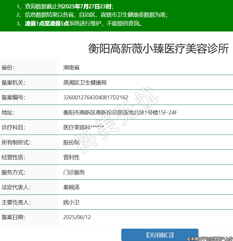 省份:湖南省備案機(jī)關(guān):蒸湘區(qū)衛(wèi)生健康局備案編號(hào):32600127643040817D2162地址:衡陽市高新區(qū)高新投總部基地北塊1號(hào)樓15F-24F診療科目:醫(yī)療美容科******所有制形式:股份制經(jīng)營性質(zhì):營利性服務(wù)方式:門診服務(wù)法定代表人:秦婉濤主要負(fù)責(zé)人:姚小衛(wèi)備案日期:2025/06/12 -