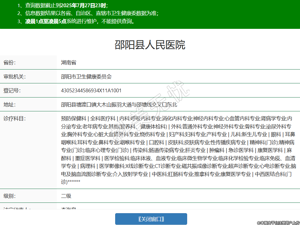 省份:湖南省審批機關(guān):邵陽市衛(wèi)生健康委員會登記號:43052344586934X11A1001地址:邵陽縣塘渡口鎮(zhèn)大木山振羽大道與邵塘線交叉口東北診療科目:預(yù)防保健科 | 全科醫(yī)療科 | 內(nèi)科;呼吸內(nèi)科專業(yè);消化內(nèi)科專業(yè);神經(jīng)內(nèi)科專業(yè);心血管內(nèi)科專業(yè);腎病學(xué)專業(yè);內(nèi)分泌專業(yè);老年病專業(yè);其他(營養(yǎng)科、健康體檢科) | 外科;普通外科專業(yè);神經(jīng)外科專業(yè);骨科專業(yè);泌尿外科專業(yè);胸外科專業(yè);心臟大血管外科專業(yè);燒傷科專業(yè) | 婦產(chǎn)科;婦科專業(yè);產(chǎn)科專業(yè) | 兒科;新生兒專業(yè) | 眼科 | 耳鼻咽喉科;耳科專業(yè);鼻科專業(yè);咽喉科專業(yè) | 口腔科 | 皮膚科;皮膚病專業(yè);性傳播疾病專業(yè) | 精神科(門診);精神病專業(yè)(門診);臨床心理專業(yè)(門診) | 傳染科;腸道傳染病專業(yè);肝炎專業(yè) | 腫瘤科 | 急診醫(yī)學(xué)科 | 康復(fù)醫(yī)學(xué)科 | 麻醉科 | 重癥醫(yī)學(xué)科 | 醫(yī)學(xué)檢驗科;臨床體液、血液專業(yè);臨床微生物學(xué)專業(yè);臨床化學(xué)檢驗專業(yè);臨床免疫、血清學(xué)專業(yè) | 病理科 | 醫(yī)學(xué)影像科;X線診斷專業(yè);CT診斷專業(yè);磁共振成像診斷專業(yè);超聲診斷專業(yè);心電診斷專業(yè);腦電及腦血流圖診斷專業(yè);介入放射學(xué)專業(yè) | 中醫(yī)科;肛腸科專業(yè);推拿科專業(yè);康復(fù)醫(yī)學(xué)專業(yè) | 中西醫(yī)結(jié)合科(門診)******級別:二級法定代表人:李海泉主要負責人:李海泉執(zhí)業(yè)許可證有效期:2025/04/03 -至- 2028/04/11 -