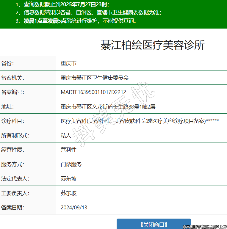 省份:重慶市備案機(jī)關(guān):重慶市綦江區(qū)衛(wèi)生健康委員會(huì)備案編號(hào):MADTE163950011017D2212地址:重慶市綦江區(qū)文龍街道長(zhǎng)生路88號(hào)1幢2層診療科目:醫(yī)療美容科(美容外科、美容皮膚科 完成醫(yī)療美容診療項(xiàng)目備案)******所有制形式:私人經(jīng)營(yíng)性質(zhì):營(yíng)利性服務(wù)方式:門診服務(wù)法定代表人:蘇東坡主要負(fù)責(zé)人:蘇東坡備案日期:2024/09/13 -