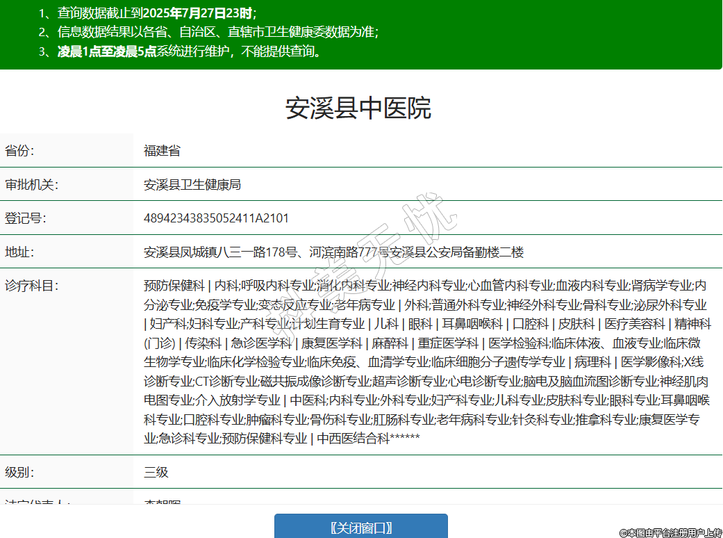 省份:福建省審批機關(guān):安溪縣衛(wèi)生健康局登記號:48942343835052411A2101地址:安溪縣鳳城鎮(zhèn)八三一路178號、河濱南路777號安溪縣公安局備勤樓二樓診療科目:預(yù)防保健科 | 內(nèi)科;呼吸內(nèi)科專業(yè);消化內(nèi)科專業(yè);神經(jīng)內(nèi)科專業(yè);心血管內(nèi)科專業(yè);血液內(nèi)科專業(yè);腎病學(xué)專業(yè);內(nèi)分泌專業(yè);免疫學(xué)專業(yè);變態(tài)反應(yīng)專業(yè);老年病專業(yè) | 外科;普通外科專業(yè);神經(jīng)外科專業(yè);骨科專業(yè);泌尿外科專業(yè) | 婦產(chǎn)科;婦科專業(yè);產(chǎn)科專業(yè);計劃生育專業(yè) | 兒科 | 眼科 | 耳鼻咽喉科 | 口腔科 | 皮膚科 | 醫(yī)療美容科 | 精神科(門診) | 傳染科 | 急診醫(yī)學(xué)科 | 康復(fù)醫(yī)學(xué)科 | 麻醉科 | 重癥醫(yī)學(xué)科 | 醫(yī)學(xué)檢驗科;臨床體液、血液專業(yè);臨床微生物學(xué)專業(yè);臨床化學(xué)檢驗專業(yè);臨床免疫、血清學(xué)專業(yè);臨床細胞分子遺傳學(xué)專業(yè) | 病理科 | 醫(yī)學(xué)影像科;X線診斷專業(yè);CT診斷專業(yè);磁共振成像診斷專業(yè);超聲診斷專業(yè);心電診斷專業(yè);腦電及腦血流圖診斷專業(yè);神經(jīng)肌肉電圖專業(yè);介入放射學(xué)專業(yè) | 中醫(yī)科;內(nèi)科專業(yè);外科專業(yè);婦產(chǎn)科專業(yè);兒科專業(yè);皮膚科專業(yè);眼科專業(yè);耳鼻咽喉科專業(yè);口腔科專業(yè);腫瘤科專業(yè);骨傷科專業(yè);肛腸科專業(yè);老年病科專業(yè);針灸科專業(yè);推拿科專業(yè);康復(fù)醫(yī)學(xué)專業(yè);急診科專業(yè);預(yù)防保健科專業(yè) | 中西醫(yī)結(jié)合科******級別:三級法定代表人:李朝暉主要負責(zé)人:李朝暉執(zhí)業(yè)許可證有效期:2022/10/01 -至- 2028/09/30 -