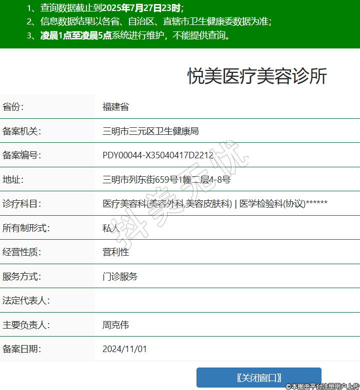 省份:福建省備案機(jī)關(guān):三明市三元區(qū)衛(wèi)生健康局備案編號:PDY00044-X35040417D2212地址:三明市列東街659號1幢二層4-8號診療科目:醫(yī)療美容科(美容外科,美容皮膚科) | 醫(yī)學(xué)檢驗科(協(xié)議)******所有制形式:私人經(jīng)營性質(zhì):營利性服務(wù)方式:門診服務(wù)法定代表人:主要負(fù)責(zé)人:周克偉備案日期:2024/11/01 -