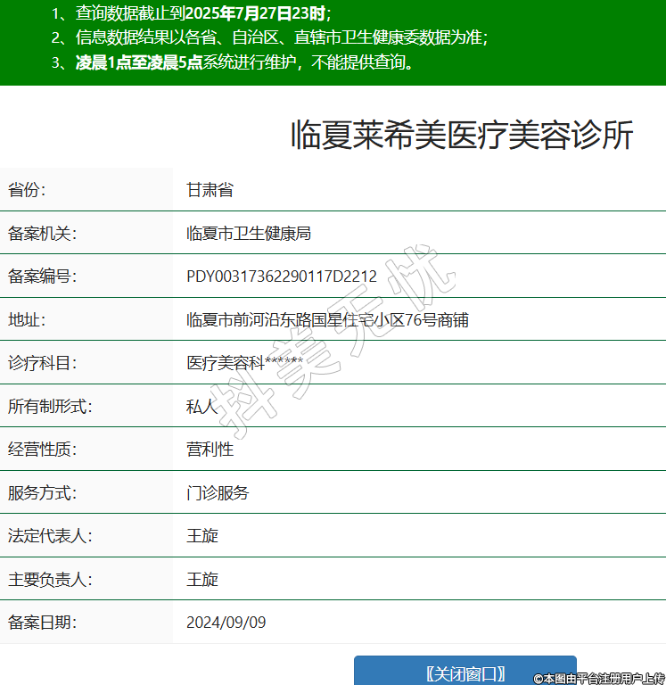 省份:甘肅省備案機(jī)關(guān):臨夏市衛(wèi)生健康局備案編號(hào):PDY00317362290117D2212地址:臨夏市前河沿東路國星住宅小區(qū)76號(hào)商鋪診療科目:醫(yī)療美容科******所有制形式:私人經(jīng)營性質(zhì):營利性服務(wù)方式:門診服務(wù)法定代表人:王旋主要負(fù)責(zé)人:王旋備案日期:2024/09/09 -