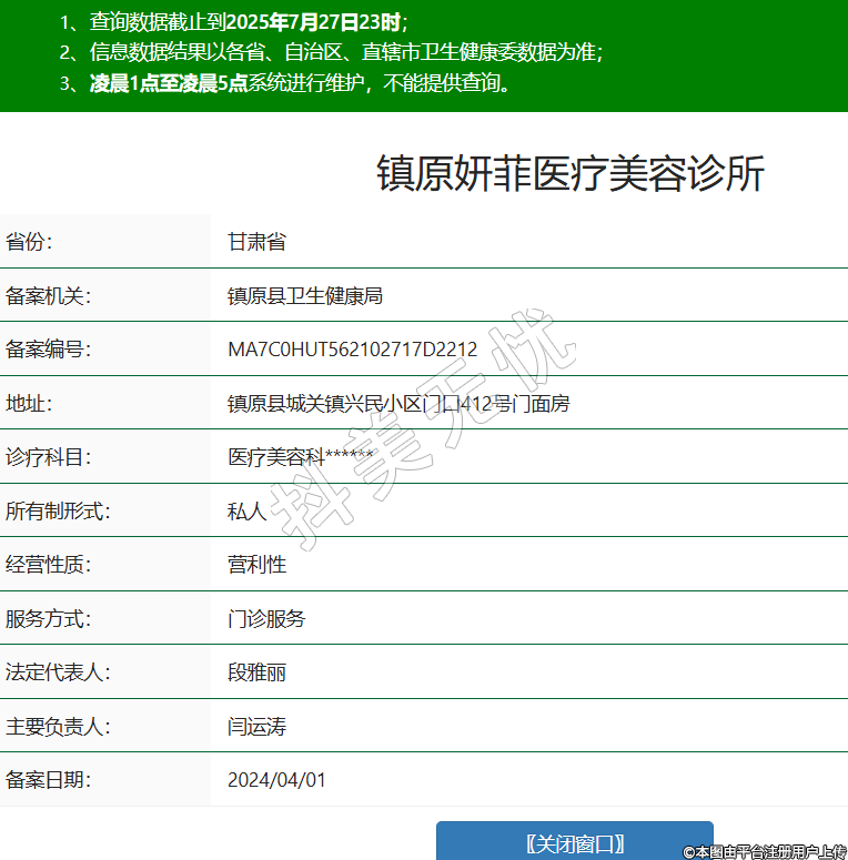 省份:甘肅省備案機(jī)關(guān):鎮(zhèn)原縣衛(wèi)生健康局備案編號(hào):MA7C0HUT562102717D2212地址:鎮(zhèn)原縣城關(guān)鎮(zhèn)興民小區(qū)門(mén)口412號(hào)門(mén)面房診療科目:醫(yī)療美容科******所有制形式:私人經(jīng)營(yíng)性質(zhì):營(yíng)利性服務(wù)方式:門(mén)診服務(wù)法定代表人:段雅麗主要負(fù)責(zé)人:閆運(yùn)濤備案日期:2024/04/01 -