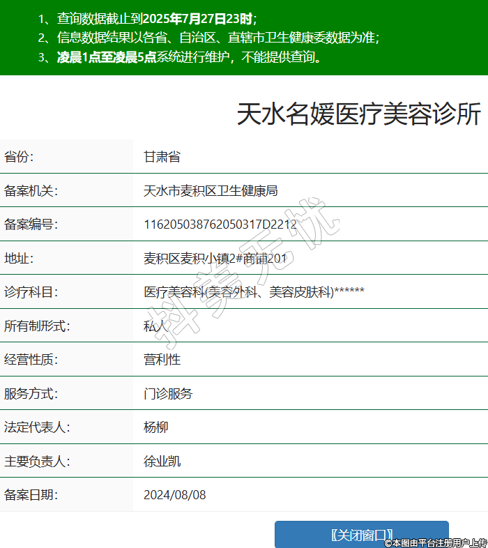 省份:甘肅省備案機(jī)關(guān):天水市麥積區(qū)衛(wèi)生健康局備案編號(hào):116205038762050317D2212地址:麥積區(qū)麥積小鎮(zhèn)2#商鋪201診療科目:醫(yī)療美容科(美容外科、美容皮膚科)******所有制形式:私人經(jīng)營(yíng)性質(zhì):營(yíng)利性服務(wù)方式:門診服務(wù)法定代表人:楊柳主要負(fù)責(zé)人:徐業(yè)凱備案日期:2024/08/08 -