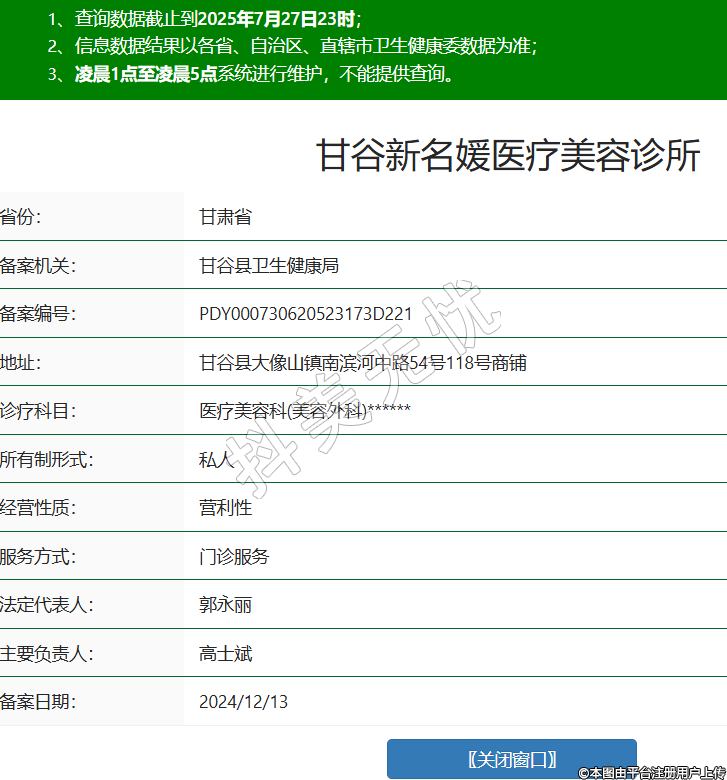 省份:甘肅省備案機關(guān):甘谷縣衛(wèi)生健康局備案編號:PDY000730620523173D221地址:甘谷縣大像山鎮(zhèn)南濱河中路54號118號商鋪診療科目:醫(yī)療美容科(美容外科)******所有制形式:私人經(jīng)營性質(zhì):營利性服務(wù)方式:門診服務(wù)法定代表人:郭永麗主要負(fù)責(zé)人:高士斌備案日期:2024/12/13 -