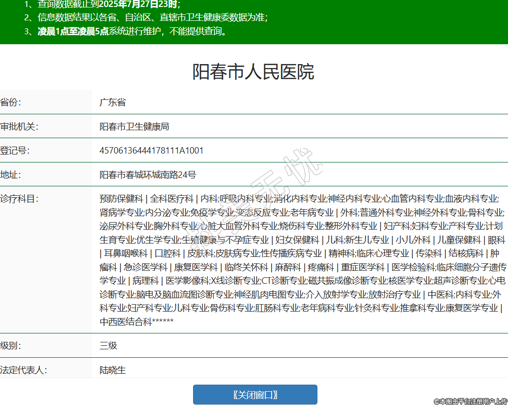 省份:廣東省審批機(jī)關(guān):陽春市衛(wèi)生健康局登記號:45706136444178111A1001地址:陽春市春城環(huán)城南路24號診療科目:預(yù)防保健科 | 全科醫(yī)療科 | 內(nèi)科;呼吸內(nèi)科專業(yè);消化內(nèi)科專業(yè);神經(jīng)內(nèi)科專業(yè);心血管內(nèi)科專業(yè);血液內(nèi)科專業(yè);腎病學(xué)專業(yè);內(nèi)分泌專業(yè);免疫學(xué)專業(yè);變態(tài)反應(yīng)專業(yè);老年病專業(yè) | 外科;普通外科專業(yè);神經(jīng)外科專業(yè);骨科專業(yè);泌尿外科專業(yè);胸外科專業(yè);心臟大血管外科專業(yè);燒傷科專業(yè);整形外科專業(yè) | 婦產(chǎn)科;婦科專業(yè);產(chǎn)科專業(yè);計劃生育專業(yè);優(yōu)生學(xué)專業(yè);生殖健康與不孕癥專業(yè) | 婦女保健科 | 兒科;新生兒專業(yè) | 小兒外科 | 兒童保健科 | 眼科 | 耳鼻咽喉科 | 口腔科 | 皮膚科;皮膚病專業(yè);性傳播疾病專業(yè) | 精神科;臨床心理專業(yè) | 傳染科 | 結(jié)核病科 | 腫瘤科 | 急診醫(yī)學(xué)科 | 康復(fù)醫(yī)學(xué)科 | 臨終關(guān)懷科 | 麻醉科 | 疼痛科 | 重癥醫(yī)學(xué)科 | 醫(yī)學(xué)檢驗科;臨床細(xì)胞分子遺傳學(xué)專業(yè) | 病理科 | 醫(yī)學(xué)影像科;X線診斷專業(yè);CT診斷專業(yè);磁共振成像診斷專業(yè);核醫(yī)學(xué)專業(yè);超聲診斷專業(yè);心電診斷專業(yè);腦電及腦血流圖診斷專業(yè);神經(jīng)肌肉電圖專業(yè);介入放射學(xué)專業(yè);放射治療專業(yè) | 中醫(yī)科;內(nèi)科專業(yè);外科專業(yè);婦產(chǎn)科專業(yè);兒科專業(yè);骨傷科專業(yè);肛腸科專業(yè);老年病科專業(yè);針灸科專業(yè);推拿科專業(yè);康復(fù)醫(yī)學(xué)專業(yè) | 中西醫(yī)結(jié)合科******級別:三級法定代表人:陸曉生主要負(fù)責(zé)人:陸曉生執(zhí)業(yè)許可證有效期:2022/12/20 -至- 2037/12/20 -