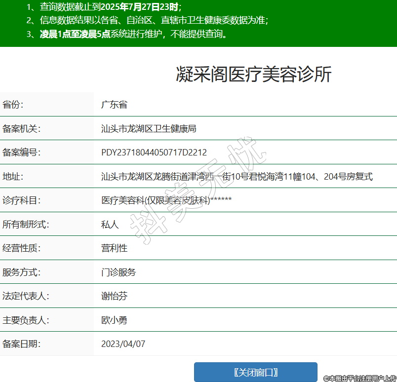 省份:廣東省備案機(jī)關(guān):汕頭市龍湖區(qū)衛(wèi)生健康局備案編號:PDY23718044050717D2212地址:汕頭市龍湖區(qū)龍騰街道津?yàn)澄饕唤?0號君悅海灣11幢104、204號房復(fù)式診療科目:醫(yī)療美容科(僅限美容皮膚科)******所有制形式:私人經(jīng)營性質(zhì):營利性服務(wù)方式:門診服務(wù)法定代表人:謝怡芬主要負(fù)責(zé)人:歐小勇備案日期:2023/04/07 -