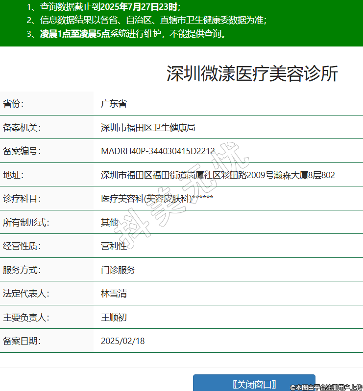 省份:廣東省備案機(jī)關(guān):深圳市福田區(qū)衛(wèi)生健康局備案編號(hào):MADRH40P-344030415D2212地址:深圳市福田區(qū)福田街道崗廈社區(qū)彩田路2009號(hào)瀚森大廈8層802診療科目:醫(yī)療美容科(美容皮膚科)******所有制形式:其他經(jīng)營(yíng)性質(zhì):營(yíng)利性服務(wù)方式:門(mén)診服務(wù)法定代表人:林雪清主要負(fù)責(zé)人:王順初備案日期:2025/02/18 -