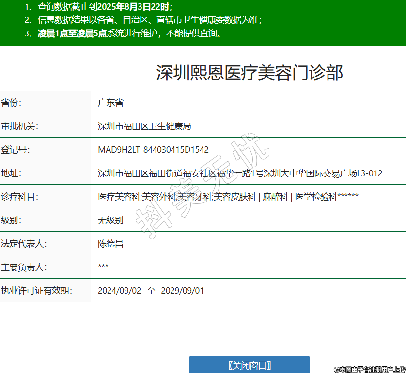 省份:廣東省審批機關:深圳市福田區(qū)衛(wèi)生健康局登記號:MAD9H2LT-844030415D1542地址:深圳市福田區(qū)福田街道福安社區(qū)福華一路1號深圳大中華國際交易廣場L3-012診療科目:醫(yī)療美容科;美容外科;美容牙科;美容皮膚科 | 麻醉科 | 醫(yī)學檢驗科******級別:無級別法定代表人:陳德昌主要負責人:***執(zhí)業(yè)許可證有效期:2024/09/02 -至- 2029/09/01 -