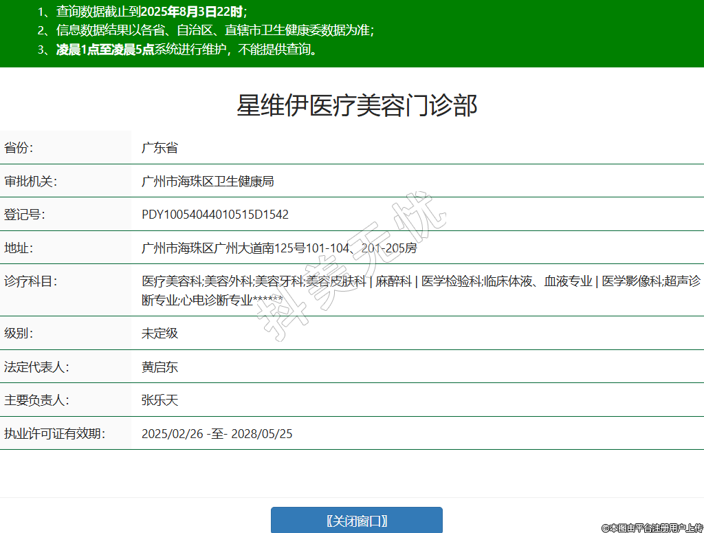 省份:廣東省審批機(jī)關(guān):廣州市海珠區(qū)衛(wèi)生健康局登記號(hào):PDY10054044010515D1542地址:廣州市海珠區(qū)廣州大道南125號(hào)101-104、201-205房診療科目:醫(yī)療美容科;美容外科;美容牙科;美容皮膚科 | 麻醉科 | 醫(yī)學(xué)檢驗(yàn)科;臨床體液、血液專業(yè) | 醫(yī)學(xué)影像科;超聲診斷專業(yè);心電診斷專業(yè)******級(jí)別:未定級(jí)法定代表人:黃啟東主要負(fù)責(zé)人:張樂(lè)天執(zhí)業(yè)許可證有效期:2025/02/26 -至- 2028/05/25 -