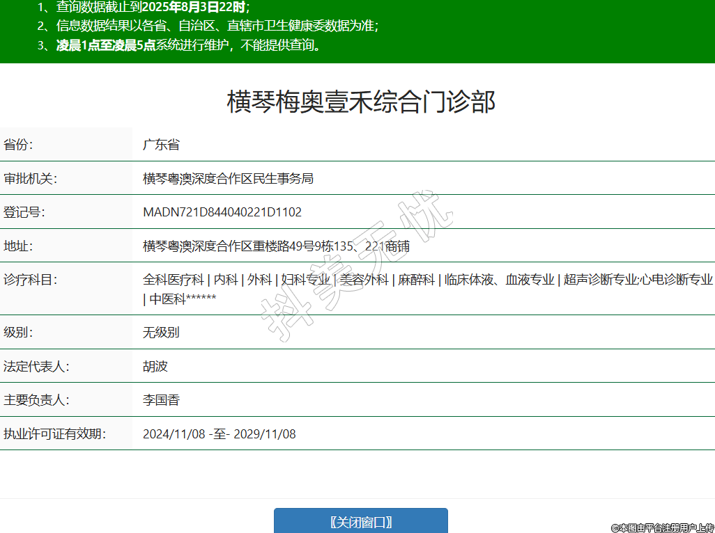 省份:廣東省審批機關:橫琴粵澳深度合作區(qū)民生事務局登記號:MADN721D844040221D1102地址:橫琴粵澳深度合作區(qū)重樓路49號9棟135、221商鋪診療科目:全科醫(yī)療科 | 內科 | 外科 | 婦科專業(yè) | 美容外科 | 麻醉科 | 臨床體液、血液專業(yè) | 超聲診斷專業(yè);心電診斷專業(yè) | 中醫(yī)科******級別:無級別法定代表人:胡波主要負責人:李國香執(zhí)業(yè)許可證有效期:2024/11/08 -至- 2029/11/08 -
