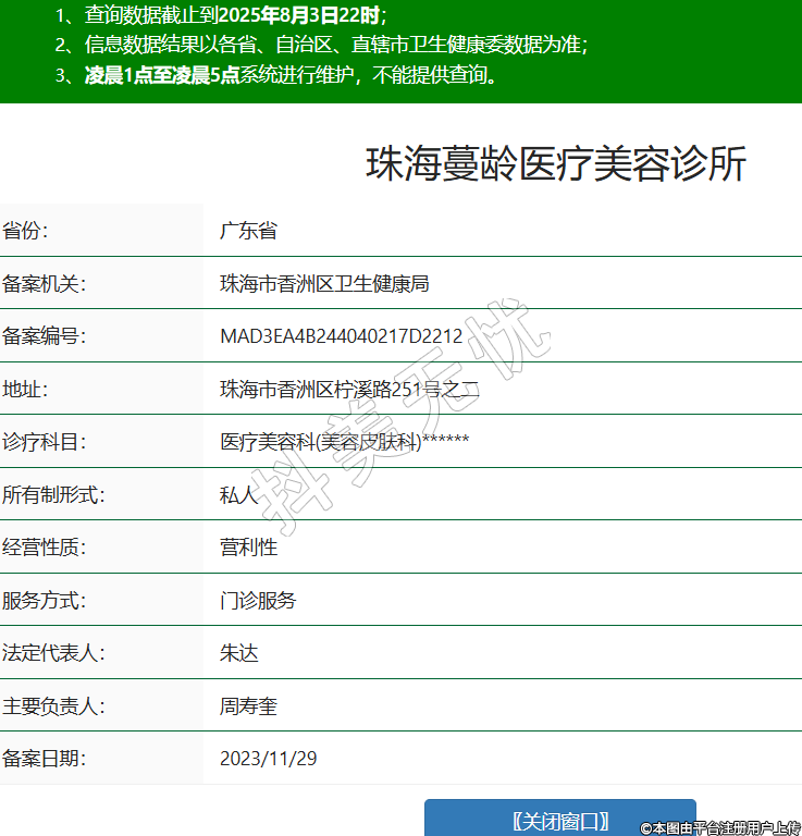 省份:廣東省備案機關:珠海市香洲區(qū)衛(wèi)生健康局備案編號:MAD3EA4B244040217D2212地址:珠海市香洲區(qū)檸溪路251號之二診療科目:醫(yī)療美容科(美容皮膚科)******所有制形式:私人經(jīng)營性質:營利性服務方式:門診服務法定代表人:朱達主要負責人:周壽奎備案日期:2023/11/29 -