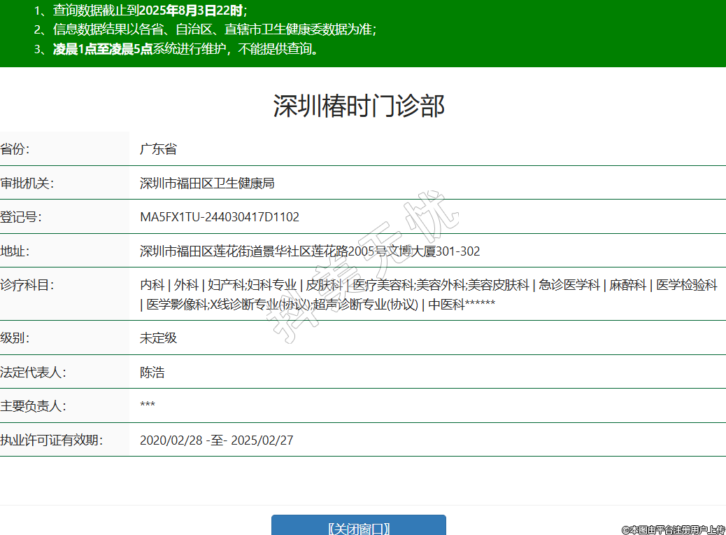 省份:廣東省審批機(jī)關(guān):深圳市福田區(qū)衛(wèi)生健康局登記號(hào):MA5FX1TU-244030417D1102地址:深圳市福田區(qū)蓮花街道景華社區(qū)蓮花路2005號(hào)文博大廈301-302診療科目:內(nèi)科 | 外科 | 婦產(chǎn)科;婦科專業(yè) | 皮膚科 | 醫(yī)療美容科;美容外科;美容皮膚科 | 急診醫(yī)學(xué)科 | 麻醉科 | 醫(yī)學(xué)檢驗(yàn)科 | 醫(yī)學(xué)影像科;X線診斷專業(yè)(協(xié)議);超聲診斷專業(yè)(協(xié)議) | 中醫(yī)科******級(jí)別:未定級(jí)法定代表人:陳浩主要負(fù)責(zé)人:***執(zhí)業(yè)許可證有效期:2020/02/28 -至- 2025/02/27 -