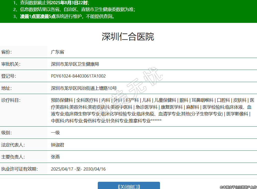 省份:廣東省審批機關:深圳市龍華區(qū)衛(wèi)生健康局登記號:PDY61024-844030617A1002地址:深圳市龍華區(qū)民治街道上塘路10號診療科目:預防保健科 | 全科醫(yī)療科 | 內科 | 外科 | 婦產(chǎn)科 | 兒科 | 兒童保健科 | 眼科 | 耳鼻咽喉科 | 口腔科 | 皮膚科 | 醫(yī)療美容科;美容外科;美容皮膚科;美容中醫(yī)科 | 急診醫(yī)學科 | 康復醫(yī)學科 | 麻醉科 | 醫(yī)學檢驗科;臨床體液、血液專業(yè);臨床微生物學專業(yè);臨床化學檢驗專業(yè);臨床免疫、血清學專業(yè);其他(分子生物學專業(yè)) | 醫(yī)學影像科 | 中醫(yī)科;內科專業(yè);骨傷科專業(yè);針灸科專業(yè);推拿科專業(yè)******級別:一級法定代表人:鐘淑君主要負責人:張燕執(zhí)業(yè)許可證有效期:2025/04/17 -至- 2030/04/16 -