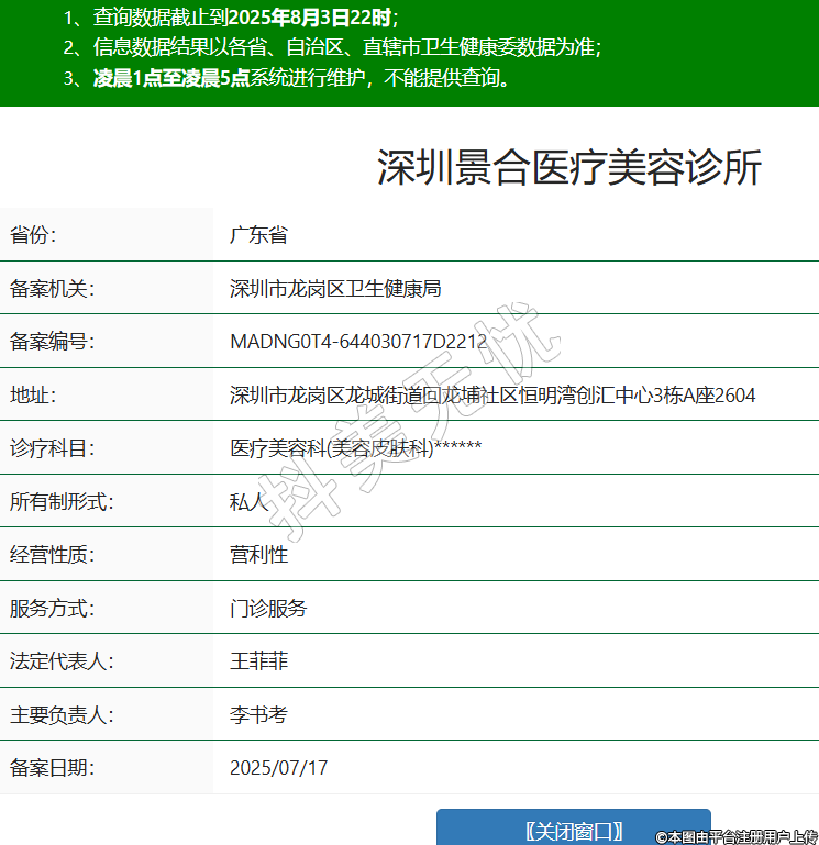 省份:廣東省備案機關:深圳市龍崗區(qū)衛(wèi)生健康局備案編號:MADNG0T4-644030717D2212地址:深圳市龍崗區(qū)龍城街道回龍埔社區(qū)恒明灣創(chuàng)匯中心3棟A座2604診療科目:醫(yī)療美容科(美容皮膚科)******所有制形式:私人經(jīng)營性質(zhì):營利性服務方式:門診服務法定代表人:王菲菲主要負責人:李書考備案日期:2025/07/17 -