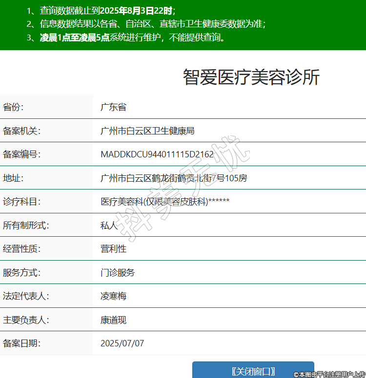 省份:廣東省備案機(jī)關(guān):廣州市白云區(qū)衛(wèi)生健康局備案編號(hào):MADDKDCU944011115D2162地址:廣州市白云區(qū)鶴龍街鶴賢北街7號(hào)105房診療科目:醫(yī)療美容科(僅限美容皮膚科)******所有制形式:私人經(jīng)營(yíng)性質(zhì):營(yíng)利性服務(wù)方式:門診服務(wù)法定代表人:凌寒梅主要負(fù)責(zé)人:康道現(xiàn)備案日期:2025/07/07 -