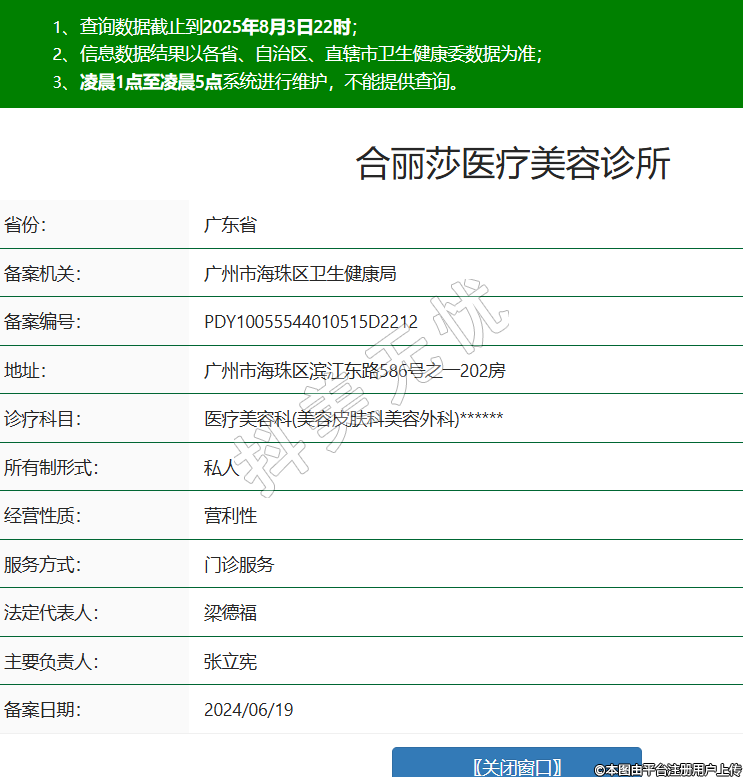 省份:廣東省備案機關:廣州市海珠區(qū)衛(wèi)生健康局備案編號:PDY10055544010515D2212地址:廣州市海珠區(qū)濱江東路586號之一202房診療科目:醫(yī)療美容科(美容皮膚科美容外科)******所有制形式:私人經(jīng)營性質:營利性服務方式:門診服務法定代表人:梁德福主要負責人:張立憲備案日期:2024/06/19 -