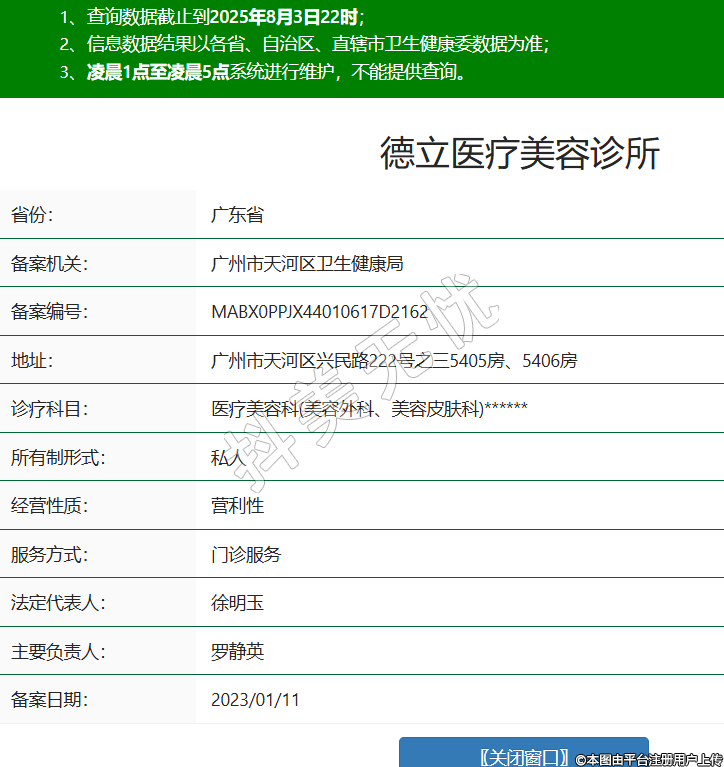 省份:廣東省備案機(jī)關(guān):廣州市天河區(qū)衛(wèi)生健康局備案編號(hào):MABX0PPJX44010617D2162地址:廣州市天河區(qū)興民路222號(hào)之三5405房、5406房診療科目:醫(yī)療美容科(美容外科、美容皮膚科)******所有制形式:私人經(jīng)營(yíng)性質(zhì):營(yíng)利性服務(wù)方式:門診服務(wù)法定代表人:徐明玉主要負(fù)責(zé)人:羅靜英備案日期:2023/01/11 -