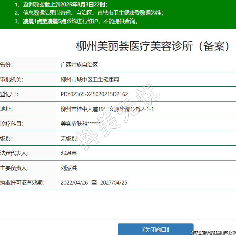 省份:廣西壯族自治區(qū)審批機關(guān):柳州市城中區(qū)衛(wèi)生健康局登記號:PDY02365-X45020215D2162地址:柳州市桂中大道19號文源華都12棟2-1-1診療科目:美容皮膚科******級別:無級別法定代表人:鄧恩蕓主要負責人:劉泓洪執(zhí)業(yè)許可證有效期:2022/04/26 -至- 2027/04/25 -