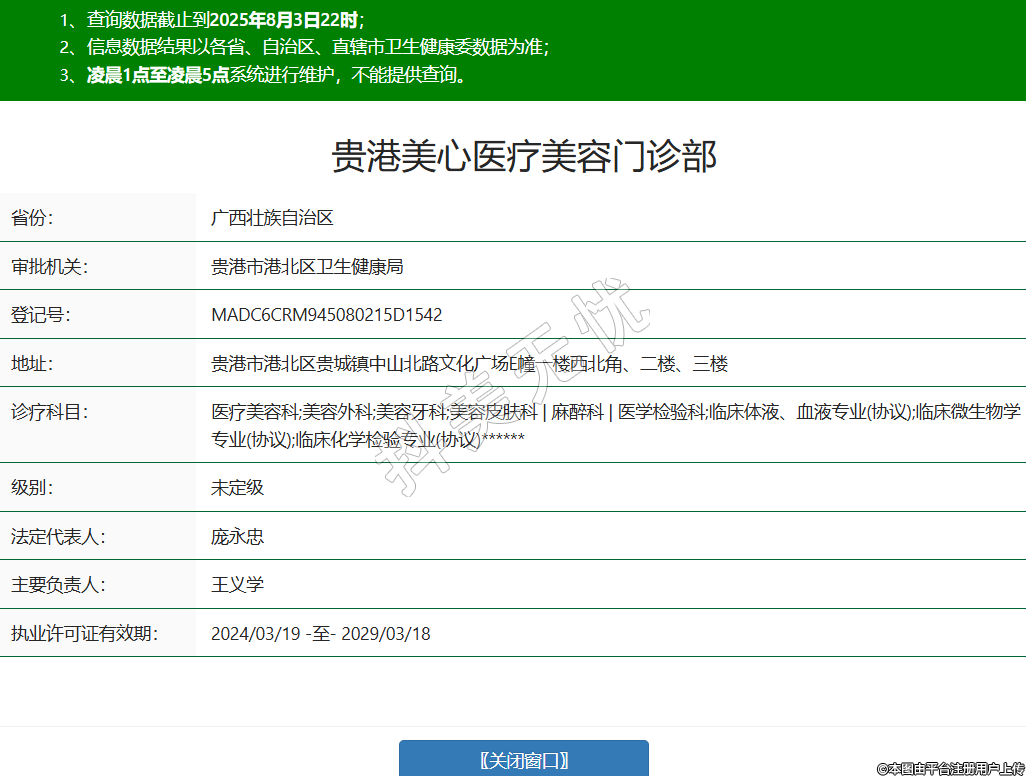 省份:廣西壯族自治區(qū)審批機(jī)關(guān):貴港市港北區(qū)衛(wèi)生健康局登記號(hào):MADC6CRM945080215D1542地址:貴港市港北區(qū)貴城鎮(zhèn)中山北路文化廣場E幢一樓西北角、二樓、三樓診療科目:醫(yī)療美容科;美容外科;美容牙科;美容皮膚科 | 麻醉科 | 醫(yī)學(xué)檢驗(yàn)科;臨床體液、血液專業(yè)(協(xié)議);臨床微生物學(xué)專業(yè)(協(xié)議);臨床化學(xué)檢驗(yàn)專業(yè)(協(xié)議)******級(jí)別:未定級(jí)法定代表人:龐永忠主要負(fù)責(zé)人:王義學(xué)執(zhí)業(yè)許可證有效期:2024/03/19 -至- 2029/03/18 -