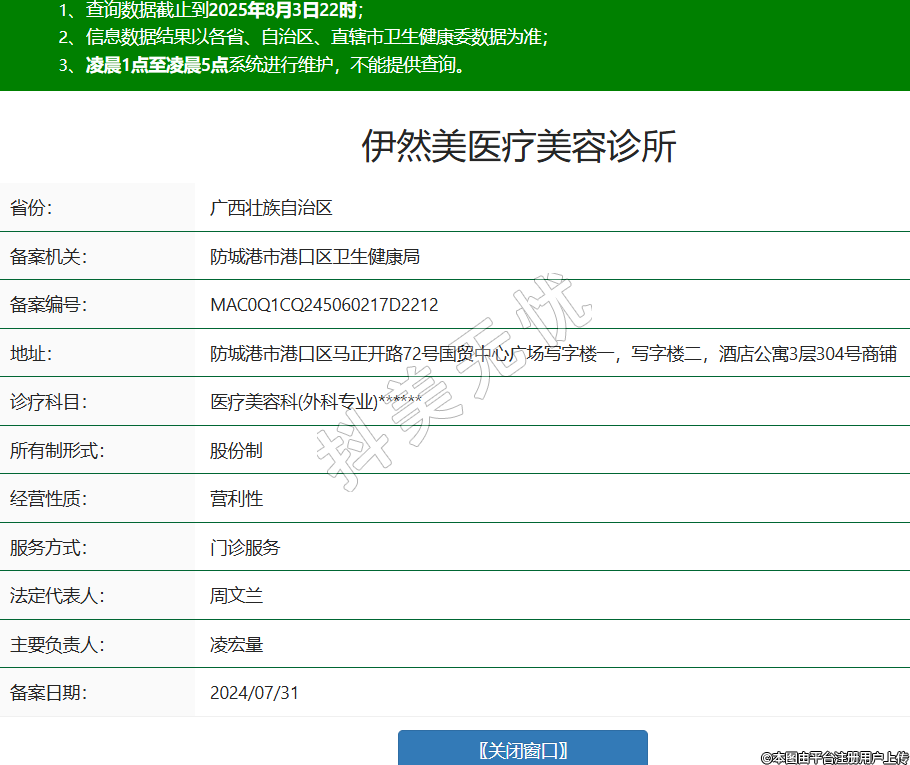 省份:廣西壯族自治區(qū)備案機關(guān):防城港市港口區(qū)衛(wèi)生健康局備案編號:MAC0Q1CQ245060217D2212地址:防城港市港口區(qū)馬正開路72號國貿(mào)中心廣場寫字樓一,寫字樓二,酒店公寓3層304號商鋪診療科目:醫(yī)療美容科(外科專業(yè))******所有制形式:股份制經(jīng)營性質(zhì):營利性服務方式:門診服務法定代表人:周文蘭主要負責人:凌宏量備案日期:2024/07/31 -