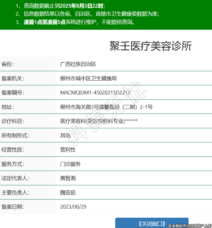 省份:廣西壯族自治區(qū)備案機(jī)關(guān):柳州市城中區(qū)衛(wèi)生健康局備案編號(hào):MACMQ0JM1-45020215D2212地址:柳州市海關(guān)路3號(hào)溫馨嘉園(二期)2-1號(hào)診療科目:醫(yī)療美容科(美容皮膚科專業(yè))******所有制形式:其他經(jīng)營(yíng)性質(zhì):營(yíng)利性服務(wù)方式:門診服務(wù)法定代表人:黃智湘主要負(fù)責(zé)人:魏亞茹備案日期:2023/08/29 -