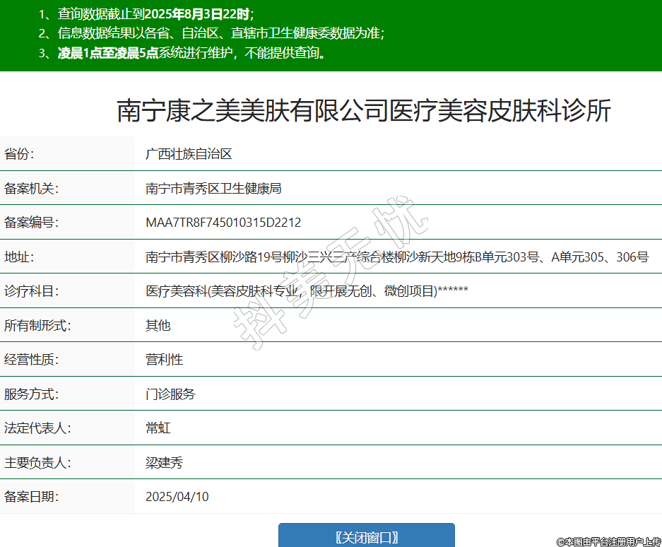 省份:廣西壯族自治區(qū)備案機(jī)關(guān):南寧市青秀區(qū)衛(wèi)生健康局備案編號(hào):MAA7TR8F745010315D2212地址:南寧市青秀區(qū)柳沙路19號(hào)柳沙三興三產(chǎn)綜合樓柳沙新天地9棟B單元303號(hào)、A單元305、306號(hào)診療科目:醫(yī)療美容科(美容皮膚科專業(yè),限開(kāi)展無(wú)創(chuàng)、微創(chuàng)項(xiàng)目)******所有制形式:其他經(jīng)營(yíng)性質(zhì):營(yíng)利性服務(wù)方式:門診服務(wù)法定代表人:常虹主要負(fù)責(zé)人:梁建秀備案日期:2025/04/10 -