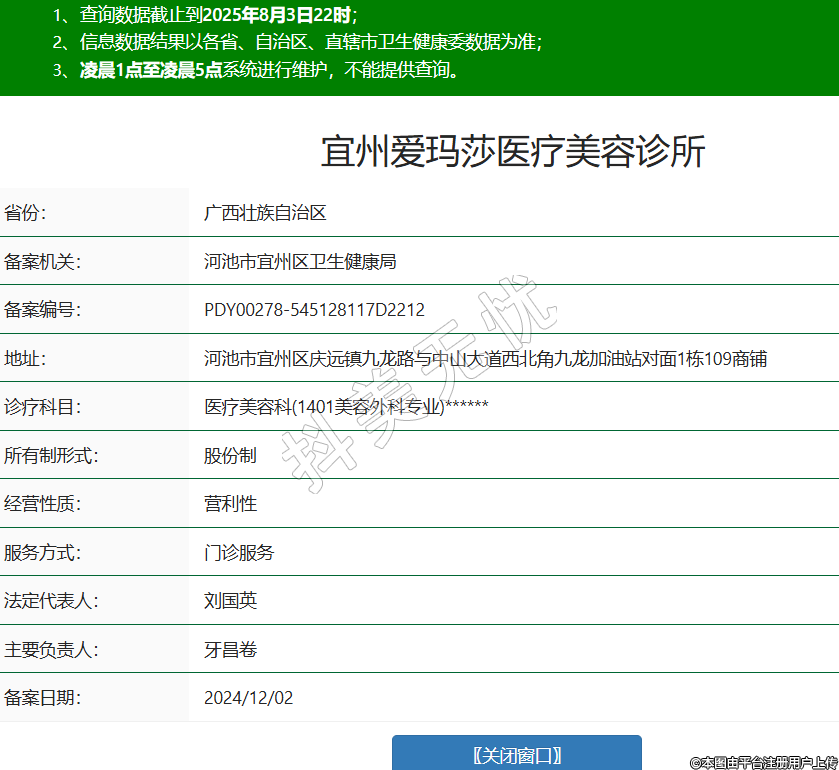 省份:廣西壯族自治區(qū)備案機(jī)關(guān):河池市宜州區(qū)衛(wèi)生健康局備案編號(hào):PDY00278-545128117D2212地址:河池市宜州區(qū)慶遠(yuǎn)鎮(zhèn)九龍路與中山大道西北角九龍加油站對(duì)面1棟109商鋪診療科目:醫(yī)療美容科(1401美容外科專業(yè))******所有制形式:股份制經(jīng)營(yíng)性質(zhì):營(yíng)利性服務(wù)方式:門診服務(wù)法定代表人:劉國(guó)英主要負(fù)責(zé)人:牙昌卷備案日期:2024/12/02 -