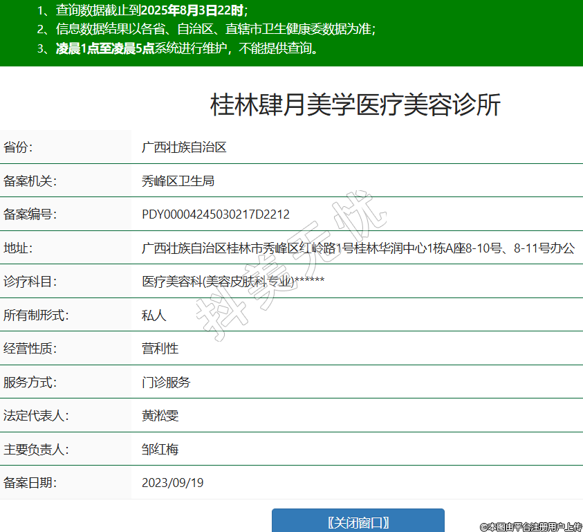 省份:廣西壯族自治區(qū)備案機(jī)關(guān):秀峰區(qū)衛(wèi)生局備案編號(hào):PDY00004245030217D2212地址:廣西壯族自治區(qū)桂林市秀峰區(qū)紅嶺路1號(hào)桂林華潤(rùn)中心1棟A座8-10號(hào)、8-11號(hào)辦公診療科目:醫(yī)療美容科(美容皮膚科專業(yè))******所有制形式:私人經(jīng)營(yíng)性質(zhì):營(yíng)利性服務(wù)方式:門診服務(wù)法定代表人:黃淞雯主要負(fù)責(zé)人:鄒紅梅備案日期:2023/09/19 -