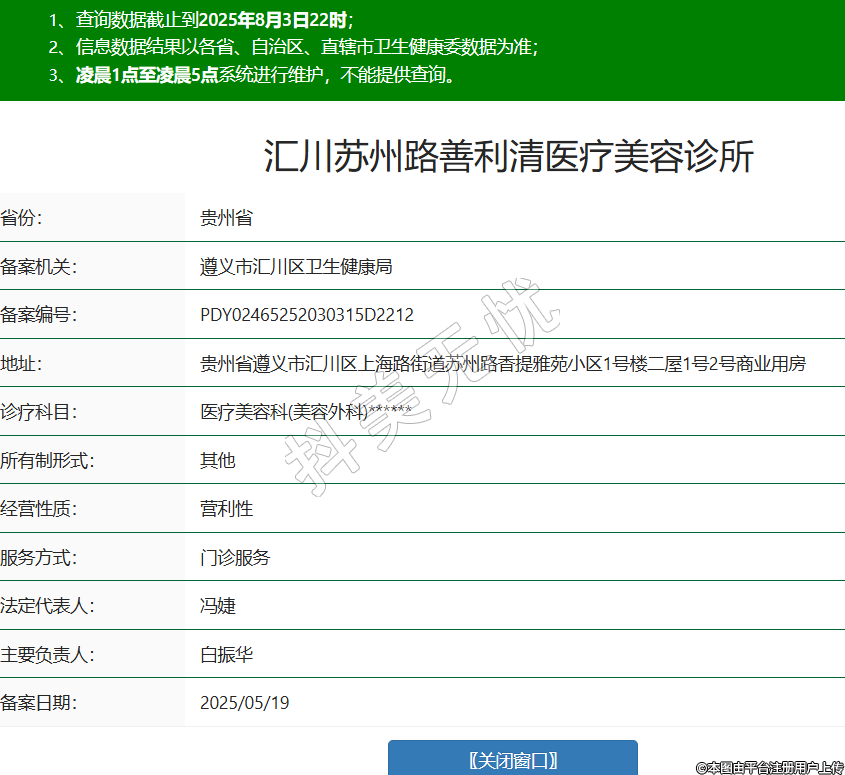 省份:貴州省備案機(jī)關(guān):遵義市匯川區(qū)衛(wèi)生健康局備案編號(hào):PDY02465252030315D2212地址:貴州省遵義市匯川區(qū)上海路街道蘇州路香提雅苑小區(qū)1號(hào)樓二屋1號(hào)2號(hào)商業(yè)用房診療科目:醫(yī)療美容科(美容外科)******所有制形式:其他經(jīng)營性質(zhì):營利性服務(wù)方式:門診服務(wù)法定代表人:馮婕主要負(fù)責(zé)人:白振華備案日期:2025/05/19 -
