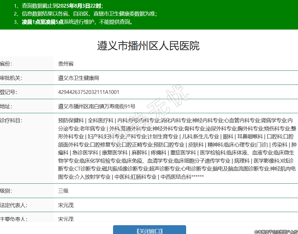 省份:貴州省審批機(jī)關(guān):遵義市衛(wèi)生健康局登記號:42944263752032111A1001地址:遵義市播州區(qū)南白鎮(zhèn)萬壽南街91號診療科目:預(yù)防保健科 | 全科醫(yī)療科 | 內(nèi)科;呼吸內(nèi)科專業(yè);消化內(nèi)科專業(yè);神經(jīng)內(nèi)科專業(yè);心血管內(nèi)科專業(yè);腎病學(xué)專業(yè);內(nèi)分泌專業(yè);老年病專業(yè) | 外科;普通外科專業(yè);神經(jīng)外科專業(yè);骨科專業(yè);泌尿外科專業(yè);胸外科專業(yè);燒傷科專業(yè);整形外科專業(yè) | 婦產(chǎn)科;婦科專業(yè);產(chǎn)科專業(yè);計(jì)劃生育專業(yè) | 兒科;新生兒專業(yè) | 眼科 | 耳鼻咽喉科 | 口腔科;口腔頜面外科專業(yè);口腔修復(fù)專業(yè);口腔正畸專業(yè);預(yù)防口腔專業(yè) | 皮膚科 | 精神科;臨床心理專業(yè)(門診) | 傳染科 | 腫瘤科 | 急診醫(yī)學(xué)科 | 康復(fù)醫(yī)學(xué)科 | 麻醉科 | 疼痛科 | 重癥醫(yī)學(xué)科 | 醫(yī)學(xué)檢驗(yàn)科;臨床體液、血液專業(yè);臨床微生物學(xué)專業(yè);臨床化學(xué)檢驗(yàn)專業(yè);臨床免疫、血清學(xué)專業(yè);臨床細(xì)胞分子遺傳學(xué)專業(yè) | 病理科 | 醫(yī)學(xué)影像科;X線診斷專業(yè);CT診斷專業(yè);磁共振成像診斷專業(yè);超聲診斷專業(yè);心電診斷專業(yè);腦電及腦血流圖診斷專業(yè);神經(jīng)肌肉電圖專業(yè);介入放射學(xué)專業(yè) | 中醫(yī)科;肛腸科專業(yè) | 中西醫(yī)結(jié)合科******級別:三級法定代表人:宋元茂主要負(fù)責(zé)人:宋元茂執(zhí)業(yè)許可證有效期:2025/02/01 -至- 2040/01/31 -