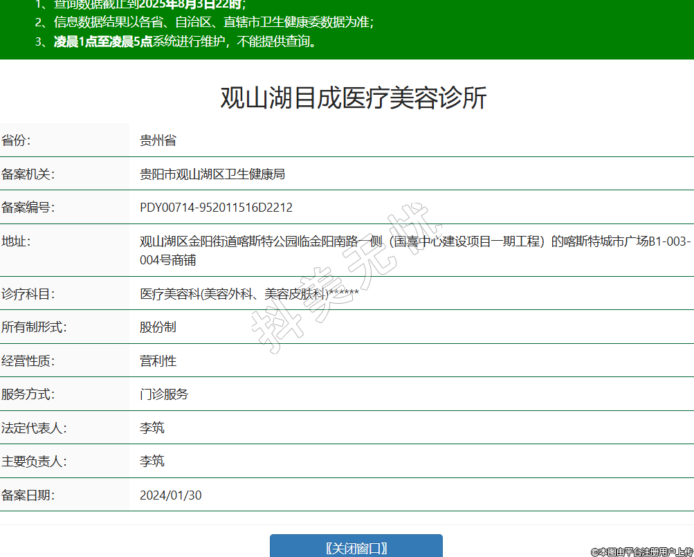 省份:貴州省備案機(jī)關(guān):貴陽(yáng)市觀山湖區(qū)衛(wèi)生健康局備案編號(hào):PDY00714-952011516D2212地址:觀山湖區(qū)金陽(yáng)街道喀斯特公園臨金陽(yáng)南路一側(cè)(國(guó)喜中心建設(shè)項(xiàng)目一期工程)的喀斯特城市廣場(chǎng)B1-003-004號(hào)商鋪診療科目:醫(yī)療美容科(美容外科、美容皮膚科)******所有制形式:股份制經(jīng)營(yíng)性質(zhì):營(yíng)利性服務(wù)方式:門診服務(wù)法定代表人:李筑主要負(fù)責(zé)人:李筑備案日期:2024/01/30 -