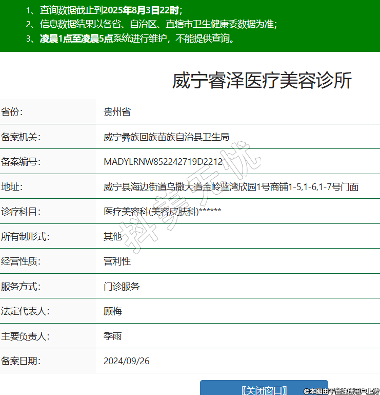 省份:貴州省備案機(jī)關(guān):威寧彝族回族苗族自治縣衛(wèi)生局備案編號(hào):MADYLRNW852242719D2212地址:威寧縣海邊街道烏撒大道金嶺藍(lán)灣欣園1號(hào)商鋪1-5,1-6,1-7號(hào)門(mén)面診療科目:醫(yī)療美容科(美容皮膚科)******所有制形式:其他經(jīng)營(yíng)性質(zhì):營(yíng)利性服務(wù)方式:門(mén)診服務(wù)法定代表人:顧梅主要負(fù)責(zé)人:季雨備案日期:2024/09/26 -