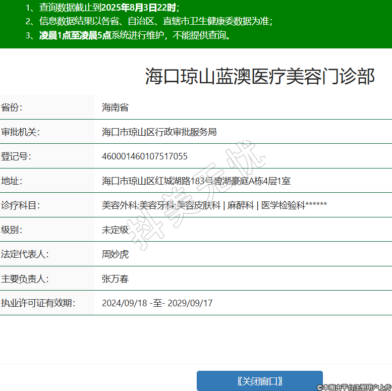 省份:海南省審批機關(guān):??谑协偵絽^(qū)行政審批服務(wù)局登記號:460001460107517055地址:??谑协偵絽^(qū)紅城湖路183號碧湖豪庭A棟4層1室診療科目:美容外科;美容牙科;美容皮膚科 | 麻醉科 | 醫(yī)學檢驗科******級別:未定級法定代表人:周妙虎主要負責人:張萬春執(zhí)業(yè)許可證有效期:2024/09/18 -至- 2029/09/17 -