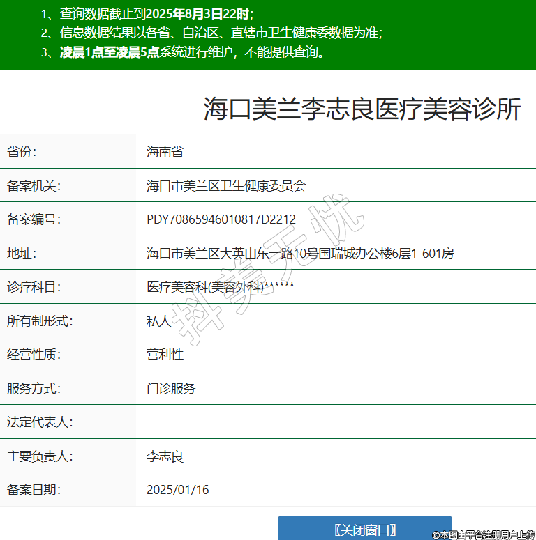 省份:海南省備案機關(guān):??谑忻捞m區(qū)衛(wèi)生健康委員會備案編號:PDY70865946010817D2212地址:海口市美蘭區(qū)大英山東一路10號國瑞城辦公樓6層1-601房診療科目:醫(yī)療美容科(美容外科)******所有制形式:私人經(jīng)營性質(zhì):營利性服務(wù)方式:門診服務(wù)法定代表人:主要負責人:李志良備案日期:2025/01/16 -