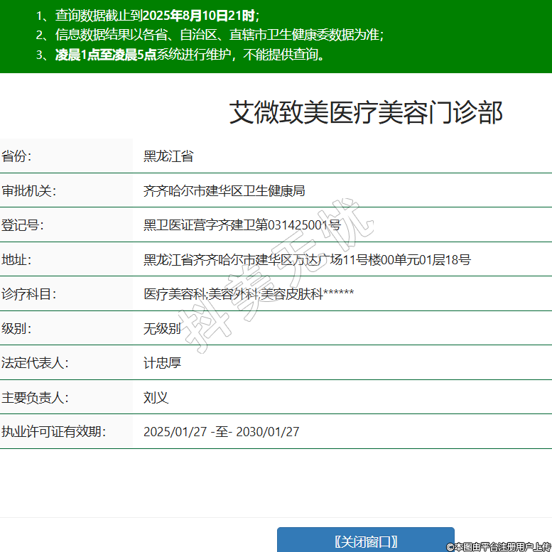 省份:黑龍江省審批機(jī)關(guān):齊齊哈爾市建華區(qū)衛(wèi)生健康局登記號(hào):黑衛(wèi)醫(yī)證營字齊建衛(wèi)第031425001號(hào)地址:黑龍江省齊齊哈爾市建華區(qū)萬達(dá)廣場(chǎng)11號(hào)樓00單元01層18號(hào)診療科目:醫(yī)療美容科;美容外科;美容皮膚科******級(jí)別:無級(jí)別法定代表人:計(jì)忠厚主要負(fù)責(zé)人:劉義執(zhí)業(yè)許可證有效期:2025/01/27 -至- 2030/01/27 -