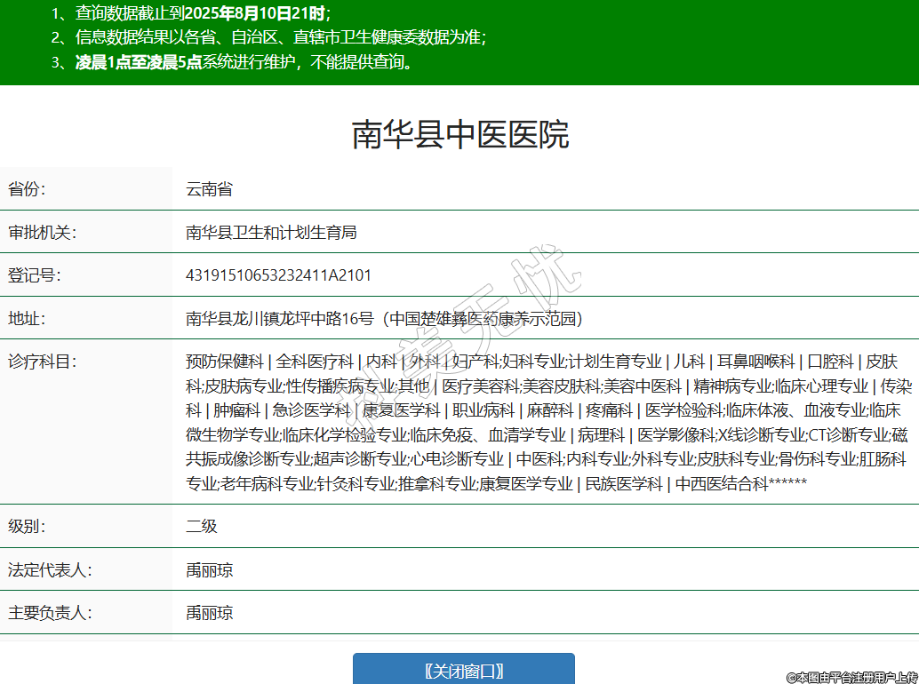 省份:云南省審批機(jī)關(guān):南華縣衛(wèi)生和計(jì)劃生育局登記號(hào):43191510653232411A2101地址:南華縣龍川鎮(zhèn)龍坪中路16號(hào)(中國(guó)楚雄彝醫(yī)藥康養(yǎng)示范園)診療科目:預(yù)防保健科 | 全科醫(yī)療科 | 內(nèi)科 | 外科 | 婦產(chǎn)科;婦科專業(yè);計(jì)劃生育專業(yè) | 兒科 | 耳鼻咽喉科 | 口腔科 | 皮膚科;皮膚病專業(yè);性傳播疾病專業(yè);其他 | 醫(yī)療美容科;美容皮膚科;美容中醫(yī)科 | 精神病專業(yè);臨床心理專業(yè) | 傳染科 | 腫瘤科 | 急診醫(yī)學(xué)科 | 康復(fù)醫(yī)學(xué)科 | 職業(yè)病科 | 麻醉科 | 疼痛科 | 醫(yī)學(xué)檢驗(yàn)科;臨床體液、血液專業(yè);臨床微生物學(xué)專業(yè);臨床化學(xué)檢驗(yàn)專業(yè);臨床免疫、血清學(xué)專業(yè) | 病理科 | 醫(yī)學(xué)影像科;X線診斷專業(yè);CT診斷專業(yè);磁共振成像診斷專業(yè);超聲診斷專業(yè);心電診斷專業(yè) | 中醫(yī)科;內(nèi)科專業(yè);外科專業(yè);皮膚科專業(yè);骨傷科專業(yè);肛腸科專業(yè);老年病科專業(yè);針灸科專業(yè);推拿科專業(yè);康復(fù)醫(yī)學(xué)專業(yè) | 民族醫(yī)學(xué)科 | 中西醫(yī)結(jié)合科******級(jí)別:二級(jí)法定代表人:禹麗瓊主要負(fù)責(zé)人:禹麗瓊執(zhí)業(yè)許可證有效期:2025/04/16 -至- 2037/12/30 -