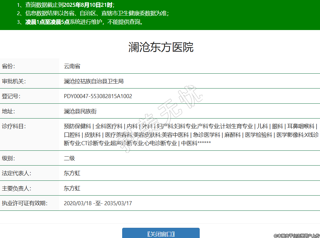 省份:云南省審批機關(guān):瀾滄拉祜族自治縣衛(wèi)生局登記號:PDY00047-553082815A1002地址:瀾滄縣民族街診療科目:預(yù)防保健科 | 全科醫(yī)療科 | 內(nèi)科 | 外科 | 婦產(chǎn)科;婦科專業(yè);產(chǎn)科專業(yè);計劃生育專業(yè) | 兒科 | 眼科 | 耳鼻咽喉科 | 口腔科 | 皮膚科 | 醫(yī)療美容科;美容皮膚科;美容中醫(yī)科 | 急診醫(yī)學(xué)科 | 麻醉科 | 醫(yī)學(xué)檢驗科 | 醫(yī)學(xué)影像科;X線診斷專業(yè);CT診斷專業(yè);超聲診斷專業(yè);心電診斷專業(yè) | 中醫(yī)科******級別:二級法定代表人:東方虹主要負責(zé)人:東方虹執(zhí)業(yè)許可證有效期:2020/03/18 -至- 2035/03/17 -