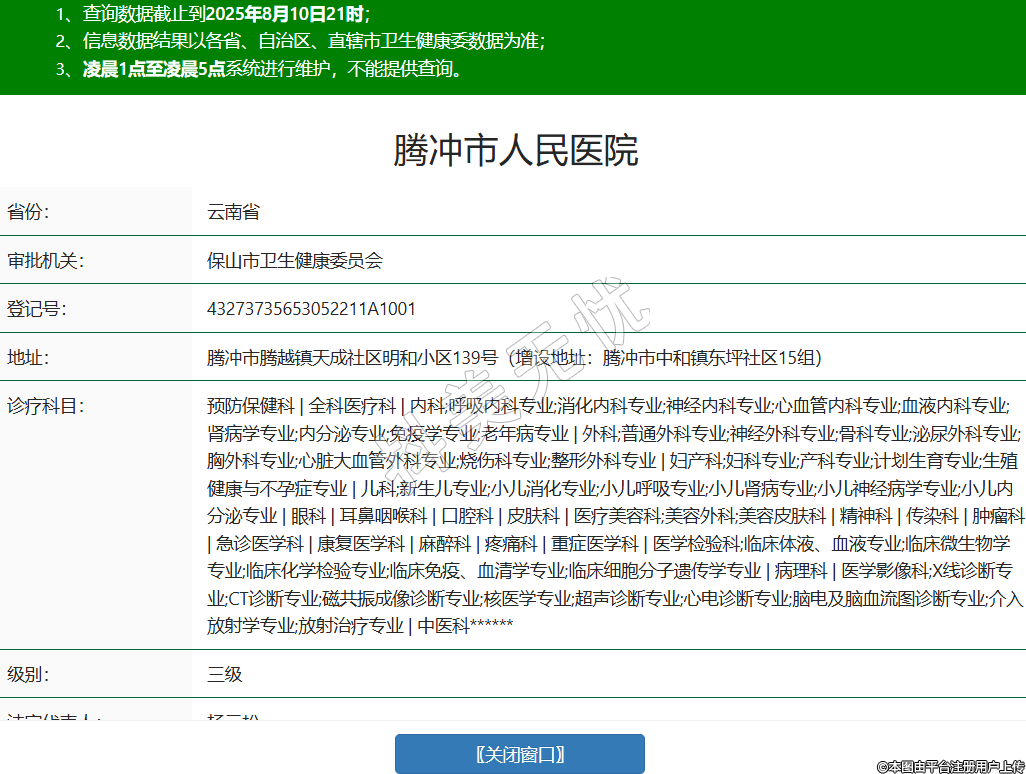 省份:云南省審批機(jī)關(guān):保山市衛(wèi)生健康委員會(huì)登記號(hào):43273735653052211A1001地址:騰沖市騰越鎮(zhèn)天成社區(qū)明和小區(qū)139號(hào)(增設(shè)地址:騰沖市中和鎮(zhèn)東坪社區(qū)15組)診療科目:預(yù)防保健科 | 全科醫(yī)療科 | 內(nèi)科;呼吸內(nèi)科專業(yè);消化內(nèi)科專業(yè);神經(jīng)內(nèi)科專業(yè);心血管內(nèi)科專業(yè);血液內(nèi)科專業(yè);腎病學(xué)專業(yè);內(nèi)分泌專業(yè);免疫學(xué)專業(yè);老年病專業(yè) | 外科;普通外科專業(yè);神經(jīng)外科專業(yè);骨科專業(yè);泌尿外科專業(yè);胸外科專業(yè);心臟大血管外科專業(yè);燒傷科專業(yè);整形外科專業(yè) | 婦產(chǎn)科;婦科專業(yè);產(chǎn)科專業(yè);計(jì)劃生育專業(yè);生殖健康與不孕癥專業(yè) | 兒科;新生兒專業(yè);小兒消化專業(yè);小兒呼吸專業(yè);小兒腎病專業(yè);小兒神經(jīng)病學(xué)專業(yè);小兒內(nèi)分泌專業(yè) | 眼科 | 耳鼻咽喉科 | 口腔科 | 皮膚科 | 醫(yī)療美容科;美容外科;美容皮膚科 | 精神科 | 傳染科 | 腫瘤科 | 急診醫(yī)學(xué)科 | 康復(fù)醫(yī)學(xué)科 | 麻醉科 | 疼痛科 | 重癥醫(yī)學(xué)科 | 醫(yī)學(xué)檢驗(yàn)科;臨床體液、血液專業(yè);臨床微生物學(xué)專業(yè);臨床化學(xué)檢驗(yàn)專業(yè);臨床免疫、血清學(xué)專業(yè);臨床細(xì)胞分子遺傳學(xué)專業(yè) | 病理科 | 醫(yī)學(xué)影像科;X線診斷專業(yè);CT診斷專業(yè);磁共振成像診斷專業(yè);核醫(yī)學(xué)專業(yè);超聲診斷專業(yè);心電診斷專業(yè);腦電及腦血流圖診斷專業(yè);介入放射學(xué)專業(yè);放射治療專業(yè) | 中醫(yī)科******級(jí)別:三級(jí)法定代表人:楊元松主要負(fù)責(zé)人:楊元松執(zhí)業(yè)許可證有效期:2025/02/24 -至- 2036/11/01 -