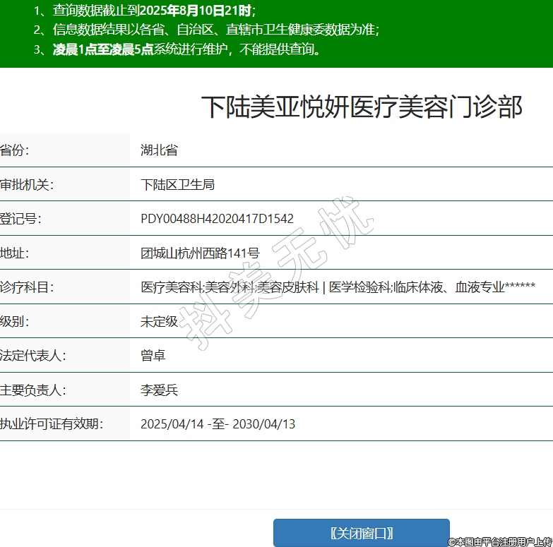 下陸美亞悅妍醫(yī)療美容門診部,診療科目:醫(yī)療美容科;美容外科;美容皮膚科 | 醫(yī)學(xué)檢驗科;臨床體液、血液專業(yè)******