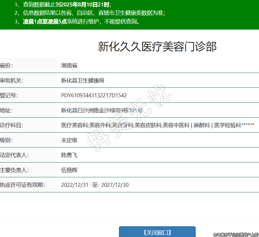 省份:湖南省審批機(jī)關(guān):新化縣衛(wèi)生健康局登記號(hào):PDY61093443132217D1542地址:新化縣白沙洲路金沙綠島9棟101號(hào)診療科目:醫(yī)療美容科;美容外科;美容牙科;美容皮膚科;美容中醫(yī)科 | 麻醉科 | 醫(yī)學(xué)檢驗(yàn)科******級(jí)別:未定級(jí)法定代表人:陳勇飛主要負(fù)責(zé)人:伍艷輝執(zhí)業(yè)許可證有效期:2022/12/31 -至- 2027/12/30 -