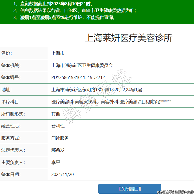 省份:上海市備案機(jī)關(guān):上海市浦東新區(qū)衛(wèi)生健康委員會(huì)備案編號(hào):PDY25861931011519D2212地址:上海市浦東新區(qū)東明路1800弄18,20,22,24號(hào)1層診療科目:醫(yī)療美容科(美容皮膚科、美容外科 醫(yī)療美容項(xiàng)目見(jiàn)附頁(yè))******所有制形式:其他經(jīng)營(yíng)性質(zhì):營(yíng)利性服務(wù)方式:門(mén)診服務(wù)法定代表人:郝希發(fā)主要負(fù)責(zé)人:李平備案日期:2024/11/20 -