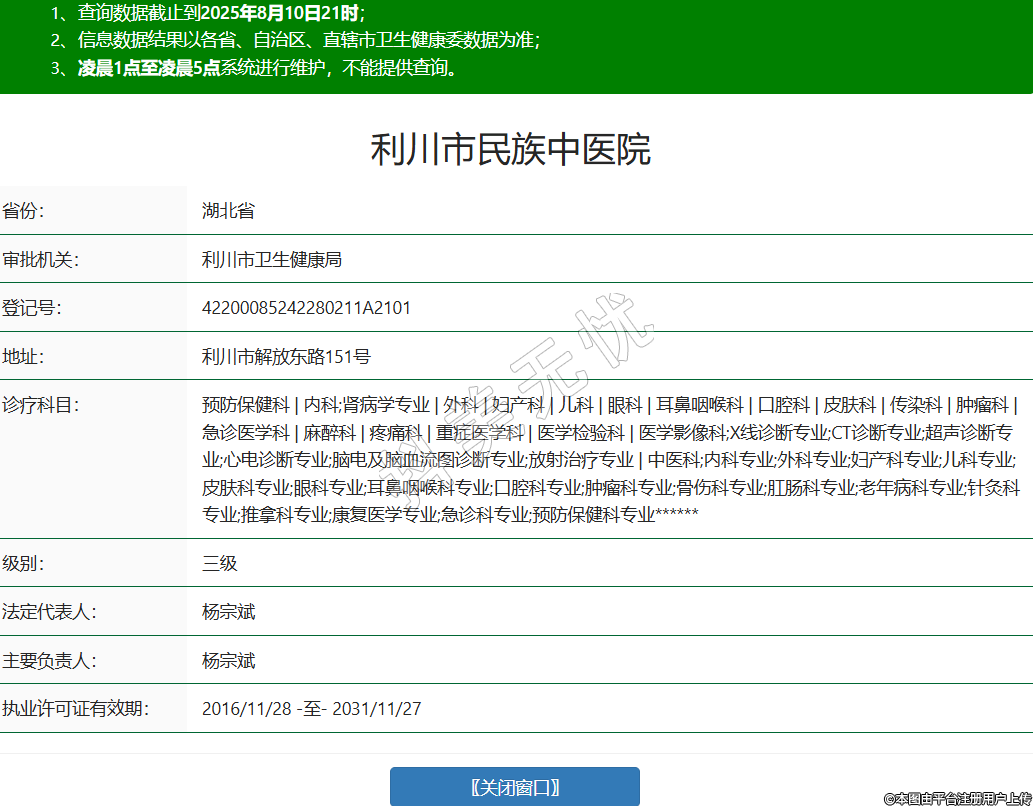 省份:湖北省審批機關(guān):利川市衛(wèi)生健康局登記號:42200085242280211A2101利川市解放東路151號診療科目:預(yù)防保健科 | 內(nèi)科;腎病學(xué)專業(yè) | 外科 | 婦產(chǎn)科 | 兒科 | 眼科 | 耳鼻咽喉科 | 口腔科 | 皮膚科 | 傳染科 | 腫瘤科 | 急診醫(yī)學(xué)科 | 麻醉科 | 疼痛科 | 重癥醫(yī)學(xué)科 | 醫(yī)學(xué)檢驗科 | 醫(yī)學(xué)影像科;X線診斷專業(yè);CT診斷專業(yè);超聲診斷專業(yè);心電診斷專業(yè);腦電及腦血流圖診斷專業(yè);放射治療專業(yè) | 中醫(yī)科;內(nèi)科專業(yè);外科專業(yè);婦產(chǎn)科專業(yè);兒科專業(yè);皮膚科專業(yè);眼科專業(yè);耳鼻咽喉科專業(yè);口腔科專業(yè);腫瘤科專業(yè);骨傷科專業(yè);肛腸科專業(yè);老年病科專業(yè);針灸科專業(yè);推拿科專業(yè);康復(fù)醫(yī)學(xué)專業(yè);急診科專業(yè);預(yù)防保健科專業(yè)******級別:三級法定代表人:楊宗斌主要負責人:楊宗斌執(zhí)業(yè)許可證有效期:2016/11/28 -至- 2031/11/27 -