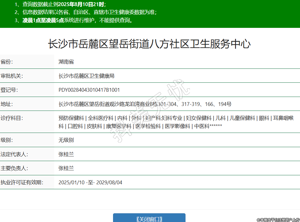 省份:湖南省審批機關:長沙市岳麓區(qū)衛(wèi)生健康局登記號:PDY00284043010417B1001地址:長沙市岳麓區(qū)望岳街道觀沙路龍泊灣商業(yè)B棟301-304、317-319、166、194號診療科目:預防保健科 | 全科醫(yī)療科 | 內(nèi)科 | 外科 | 婦產(chǎn)科;婦科專業(yè) | 婦女保健科 | 兒科 | 兒童保健科 | 眼科 | 耳鼻咽喉科 | 口腔科 | 皮膚科 | 康復醫(yī)學科 | 醫(yī)學檢驗科 | 醫(yī)學影像科 | 中醫(yī)科******級別:無級別法定代表人:張桂蘭主要負責人:張桂蘭執(zhí)業(yè)許可證有效期:2025/01/10 -至- 2029/08/04 -