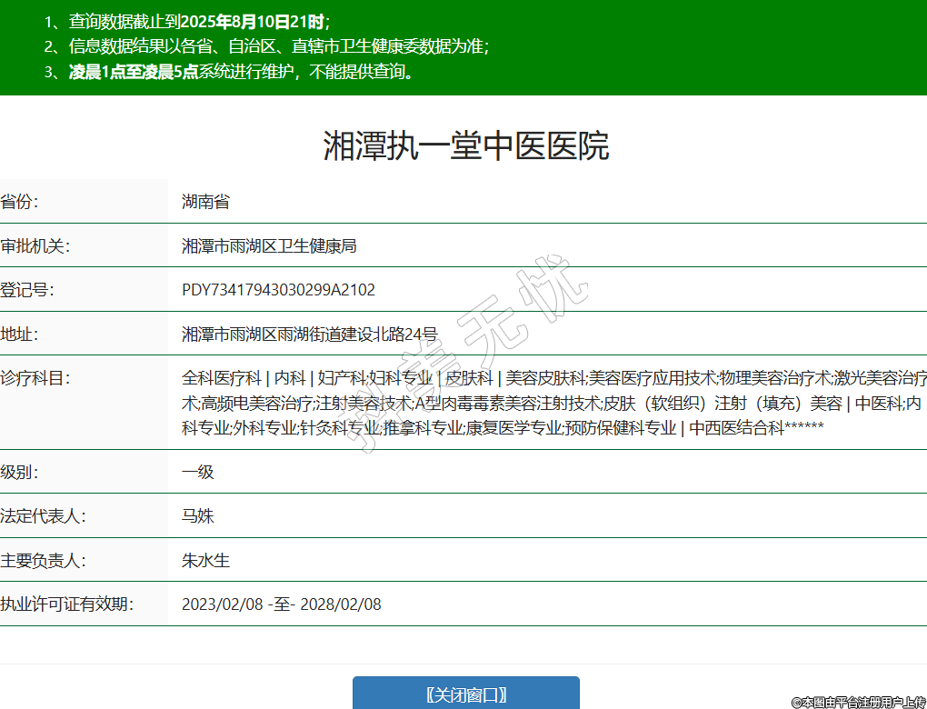 省份:湖南省審批機(jī)關(guān):湘潭市雨湖區(qū)衛(wèi)生健康局登記號(hào):PDY73417943030299A2102地址:湘潭市雨湖區(qū)雨湖街道建設(shè)北路24號(hào)診療科目:全科醫(yī)療科 | 內(nèi)科 | 婦產(chǎn)科;婦科專(zhuān)業(yè) | 皮膚科 | 美容皮膚科;美容醫(yī)療應(yīng)用技術(shù);物理美容治療術(shù);激光美容治療術(shù);高頻電美容治療;注射美容技術(shù);A型肉毒毒素美容注射技術(shù);皮膚(軟組織)注射(填充)美容 | 中醫(yī)科;內(nèi)科專(zhuān)業(yè);外科專(zhuān)業(yè);針灸科專(zhuān)業(yè);推拿科專(zhuān)業(yè);康復(fù)醫(yī)學(xué)專(zhuān)業(yè);預(yù)防保健科專(zhuān)業(yè) | 中西醫(yī)結(jié)合科******級(jí)別:一級(jí)法定代表人:馬姝主要負(fù)責(zé)人:朱水生執(zhí)業(yè)許可證有效期:2023/02/08 -至- 2028/02/08 -