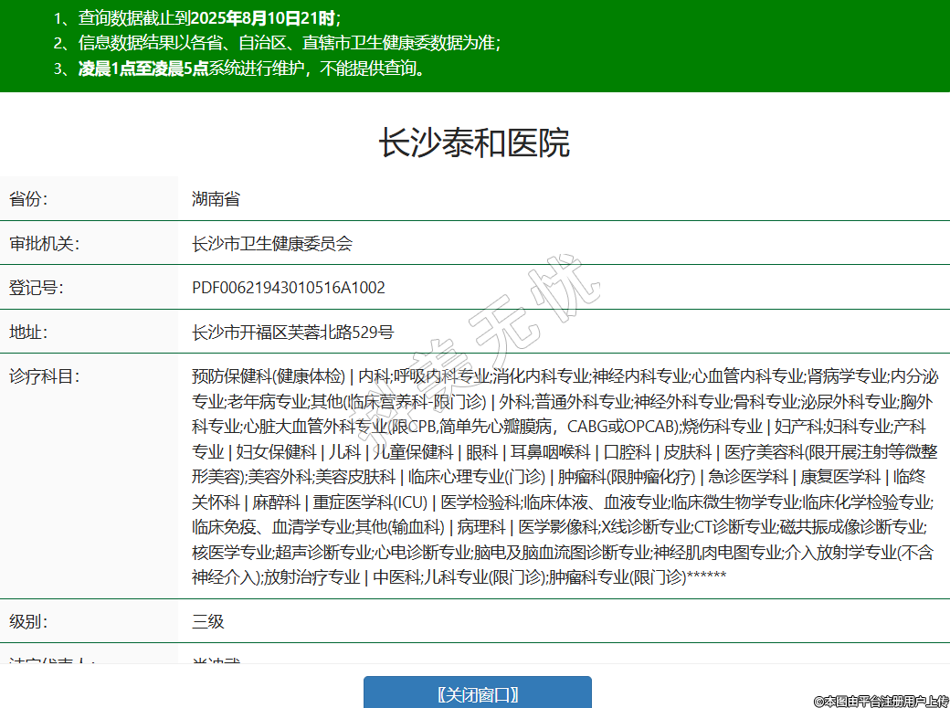 省份:湖南省審批機(jī)關(guān):長(zhǎng)沙市衛(wèi)生健康委員會(huì)登記號(hào):PDF00621943010516A1002地址:長(zhǎng)沙市開(kāi)福區(qū)芙蓉北路529號(hào)診療科目:預(yù)防保健科(健康體檢) | 內(nèi)科;呼吸內(nèi)科專(zhuān)業(yè);消化內(nèi)科專(zhuān)業(yè);神經(jīng)內(nèi)科專(zhuān)業(yè);心血管內(nèi)科專(zhuān)業(yè);腎病學(xué)專(zhuān)業(yè);內(nèi)分泌專(zhuān)業(yè);老年病專(zhuān)業(yè);其他(臨床營(yíng)養(yǎng)科-限門(mén)診) | 外科;普通外科專(zhuān)業(yè);神經(jīng)外科專(zhuān)業(yè);骨科專(zhuān)業(yè);泌尿外科專(zhuān)業(yè);胸外科專(zhuān)業(yè);心臟大血管外科專(zhuān)業(yè)(限CPB,簡(jiǎn)單先心瓣膜病,CABG或OPCAB);燒傷科專(zhuān)業(yè) | 婦產(chǎn)科;婦科專(zhuān)業(yè);產(chǎn)科專(zhuān)業(yè) | 婦女保健科 | 兒科 | 兒童保健科 | 眼科 | 耳鼻咽喉科 | 口腔科 | 皮膚科 | 醫(yī)療美容科(限開(kāi)展注射等微整形美容);美容外科;美容皮膚科 | 臨床心理專(zhuān)業(yè)(門(mén)診) | 腫瘤科(限腫瘤化療) | 急診醫(yī)學(xué)科 | 康復(fù)醫(yī)學(xué)科 | 臨終關(guān)懷科 | 麻醉科 | 重癥醫(yī)學(xué)科(ICU) | 醫(yī)學(xué)檢驗(yàn)科;臨床體液、血液專(zhuān)業(yè);臨床微生物學(xué)專(zhuān)業(yè);臨床化學(xué)檢驗(yàn)專(zhuān)業(yè);臨床免疫、血清學(xué)專(zhuān)業(yè);其他(輸血科) | 病理科 | 醫(yī)學(xué)影像科;X線(xiàn)診斷專(zhuān)業(yè);CT診斷專(zhuān)業(yè);磁共振成像診斷專(zhuān)業(yè);核醫(yī)學(xué)專(zhuān)業(yè);超聲診斷專(zhuān)業(yè);心電診斷專(zhuān)業(yè);腦電及腦血流圖診斷專(zhuān)業(yè);神經(jīng)肌肉電圖專(zhuān)業(yè);介入放射學(xué)專(zhuān)業(yè)(不含神經(jīng)介入);放射治療專(zhuān)業(yè) | 中醫(yī)科;兒科專(zhuān)業(yè)(限門(mén)診);腫瘤科專(zhuān)業(yè)(限門(mén)診)******級(jí)別:三級(jí)法定代表人:肖迪武主要負(fù)責(zé)人:肖迪武執(zhí)業(yè)許可證有效期:2024/12/06 -至- 2030/05/05 -