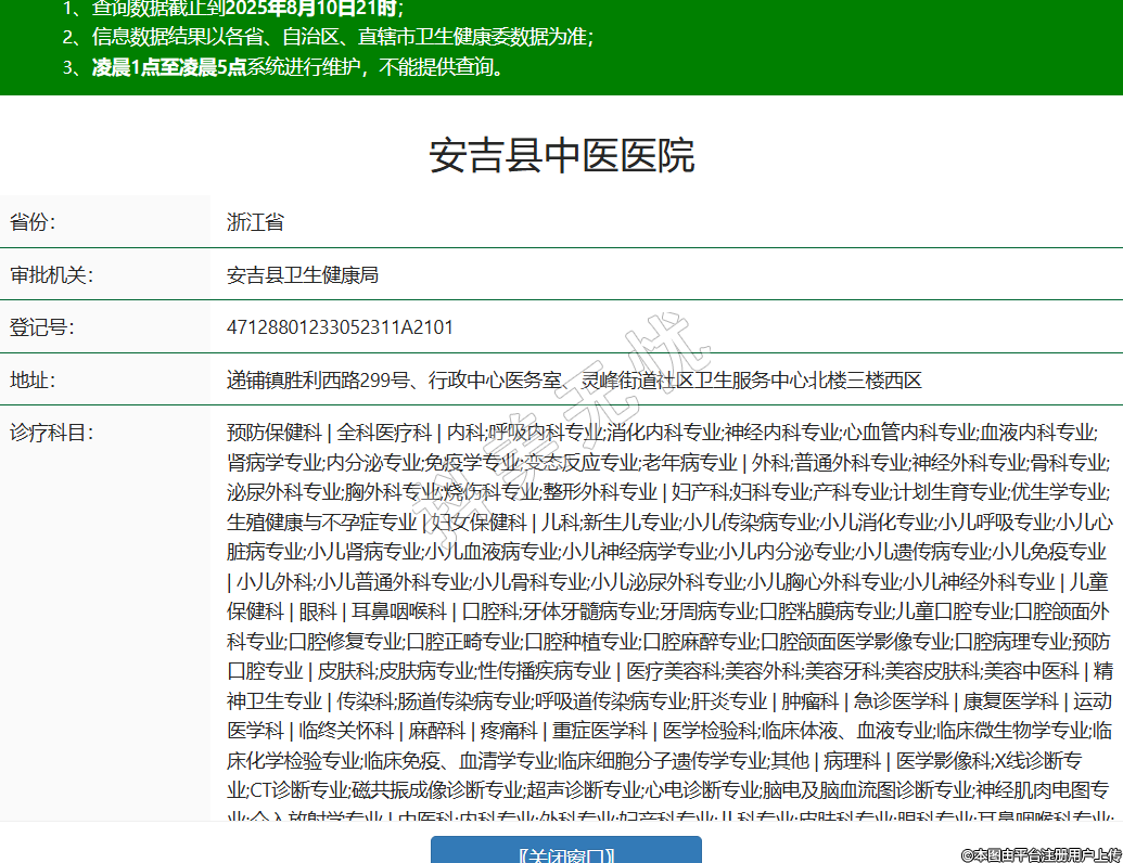 審批機(jī)關(guān):安吉縣衛(wèi)生健康局登記號:47128801233052311A2101地址:遞鋪鎮(zhèn)勝利西路299號、行政中心醫(yī)務(wù)室、靈峰街道社區(qū)衛(wèi)生服務(wù)中心北樓三樓西區(qū)診療科目:預(yù)防保健科 | 全科醫(yī)療科 | 內(nèi)科;呼吸內(nèi)科專業(yè);消化內(nèi)科專業(yè);神經(jīng)內(nèi)科專業(yè);心血管內(nèi)科專業(yè);血液內(nèi)科專業(yè);腎病學(xué)專業(yè);內(nèi)分泌專業(yè);免疫學(xué)專業(yè);變態(tài)反應(yīng)專業(yè);老年病專業(yè) | 外科;普通外科專業(yè);神經(jīng)外科專業(yè);骨科專業(yè);泌尿外科專業(yè);胸外科專業(yè);燒傷科專業(yè);整形外科專業(yè) | 婦產(chǎn)科;婦科專業(yè);產(chǎn)科專業(yè);計(jì)劃生育專業(yè);優(yōu)生學(xué)專業(yè);生殖健康與不孕癥專業(yè) | 婦女保健科 | 兒科;新生兒專業(yè);小兒傳染病專業(yè);小兒消化專業(yè);小兒呼吸專業(yè);小兒心臟病專業(yè);小兒腎病專業(yè);小兒血液病專業(yè);小兒神經(jīng)病學(xué)專業(yè);小兒內(nèi)分泌專業(yè);小兒遺傳病專業(yè);小兒免疫專業(yè) | 小兒外科;小兒普通外科專業(yè);小兒骨科專業(yè);小兒泌尿外科專業(yè);小兒胸心外科專業(yè);小兒神經(jīng)外科專業(yè) | 兒童保健科 | 眼科 | 耳鼻咽喉科 | 口腔科;牙體牙髓病專業(yè);牙周病專業(yè);口腔粘膜病專業(yè);兒童口腔專業(yè);口腔頜面外科專業(yè);口腔修復(fù)專業(yè);口腔正畸專業(yè);口腔種植專業(yè);口腔麻醉專業(yè);口腔頜面醫(yī)學(xué)影像專業(yè);口腔病理專業(yè);預(yù)防口腔專業(yè) | 皮膚科;皮膚病專業(yè);性傳播疾病專業(yè) | 醫(yī)療美容科;美容外科;美容牙科;美容皮膚科;美容中醫(yī)科 | 精神衛(wèi)生專業(yè) | 傳染科;腸道傳染病專業(yè);呼吸道傳染病專業(yè);肝炎專業(yè) | 腫瘤科 | 急診醫(yī)學(xué)科 | 康復(fù)醫(yī)學(xué)科 | 運(yùn)動(dòng)醫(yī)學(xué)科 | 臨終關(guān)懷科 | 麻醉科 | 疼痛科 | 重癥醫(yī)學(xué)科 | 醫(yī)學(xué)檢驗(yàn)科;臨床體液、血液專業(yè);臨床微生物學(xué)專業(yè);臨床化學(xué)檢驗(yàn)專業(yè);臨床免疫、血清學(xué)專業(yè);臨床細(xì)胞分子遺傳學(xué)專業(yè);其他 | 病理科 | 醫(yī)學(xué)影像科;X線診斷專業(yè);CT診斷專業(yè);磁共振成像診斷專業(yè);超聲診斷專業(yè);心電診斷專業(yè);腦電及腦血流圖診斷專業(yè);神經(jīng)肌肉電圖專業(yè);介入放射學(xué)專業(yè) | 中醫(yī)科;內(nèi)科專業(yè);外科專業(yè);婦產(chǎn)科專業(yè);兒科專業(yè);皮膚科專業(yè);眼科專業(yè);耳鼻咽喉科專業(yè);口腔科專業(yè);腫瘤科專業(yè);骨傷科專業(yè);肛腸科專業(yè);老年病科專業(yè);針灸科專業(yè);推拿科專業(yè);康復(fù)醫(yī)學(xué)專業(yè);急診科專業(yè);預(yù)防保健科專業(yè) | 中西醫(yī)結(jié)合科******級別:三級法定代表人:程艷主要負(fù)責(zé)人:程艷執(zhí)業(yè)許可證有效期:2025/04/22 -至- 2035/04/01 -